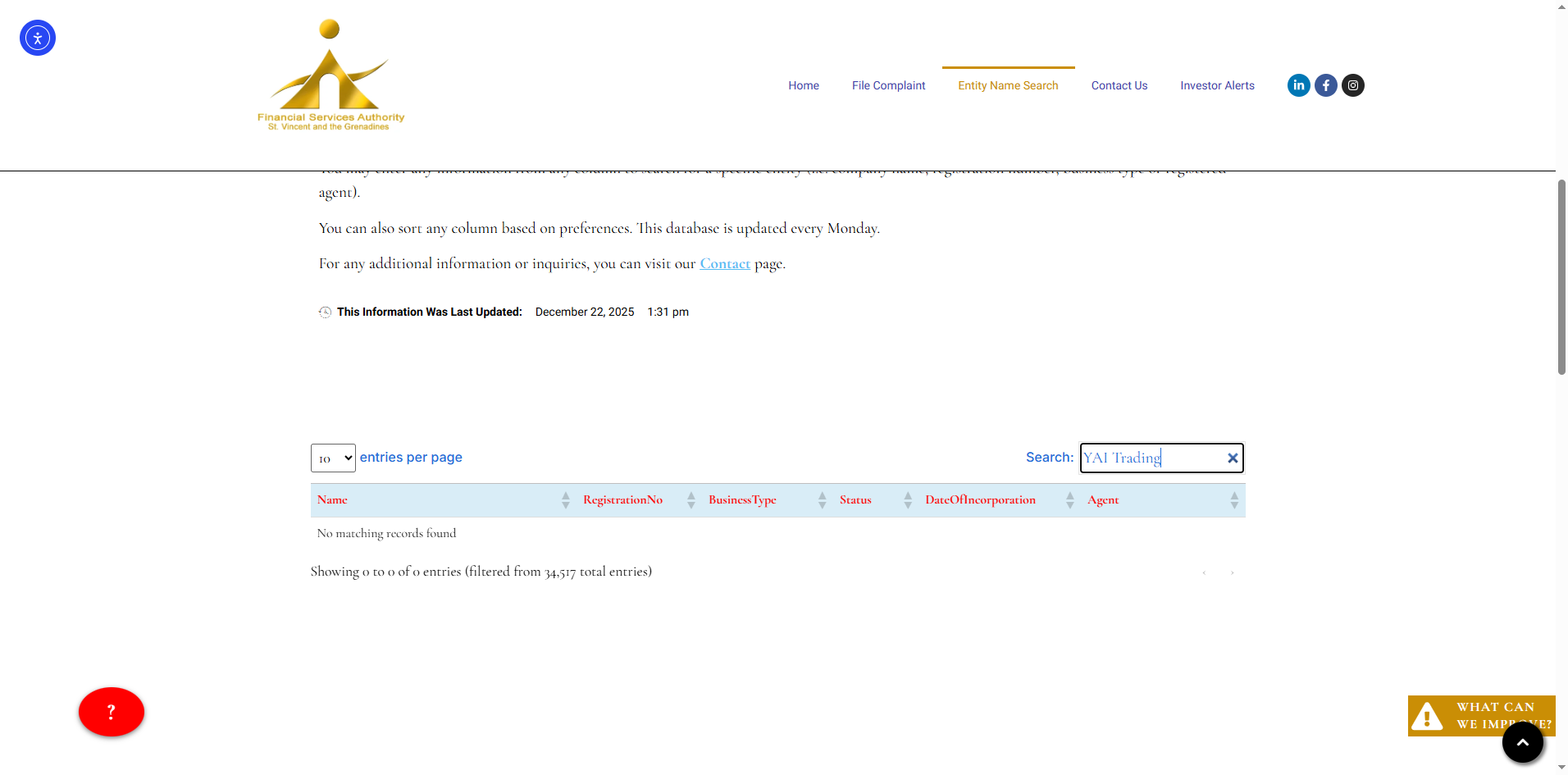 YAI Trading claims to operate under the name YAI Trading Pro and states it is registered in Saint Vincent and the Grenadines. However, our checks found no corresponding entity listed in the official registry of the Financial Services Authority (FSA) of Saint Vincent and the Grenadines. Even if such registration were confirmed, it would only confer International Business Company (IBC) status and does not equate to a legitimate financial services license. Importantly, the SVG FSA has explicitly clarified that it neither regulates nor licenses forex trading firms.