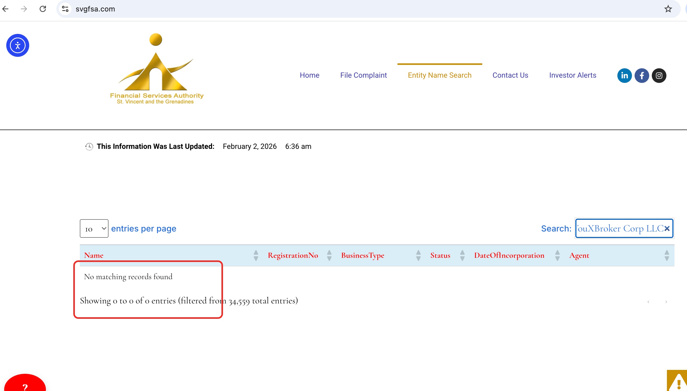 Moreover, even if the company were registered there, it is important to note that registration as an International Business Company (IBC) in Saint Vincent does not constitute authorization to operate as a forex or financial services broker. Such registration merely confirms the company’s legal existence as an IBC and carries no regulatory implications for trading activities.