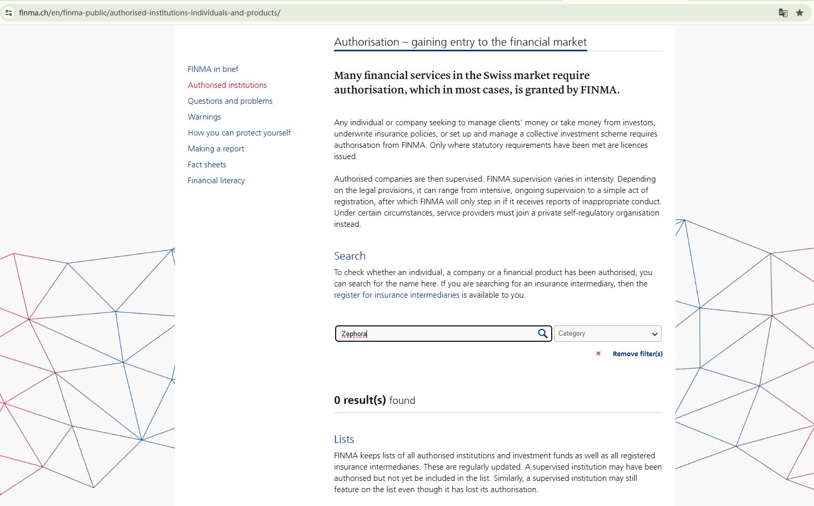 We searched the official register of the Swiss Financial Market Supervisory Authority (FINMA) using all available details, but found no record of Zephora Trade or any associated company.