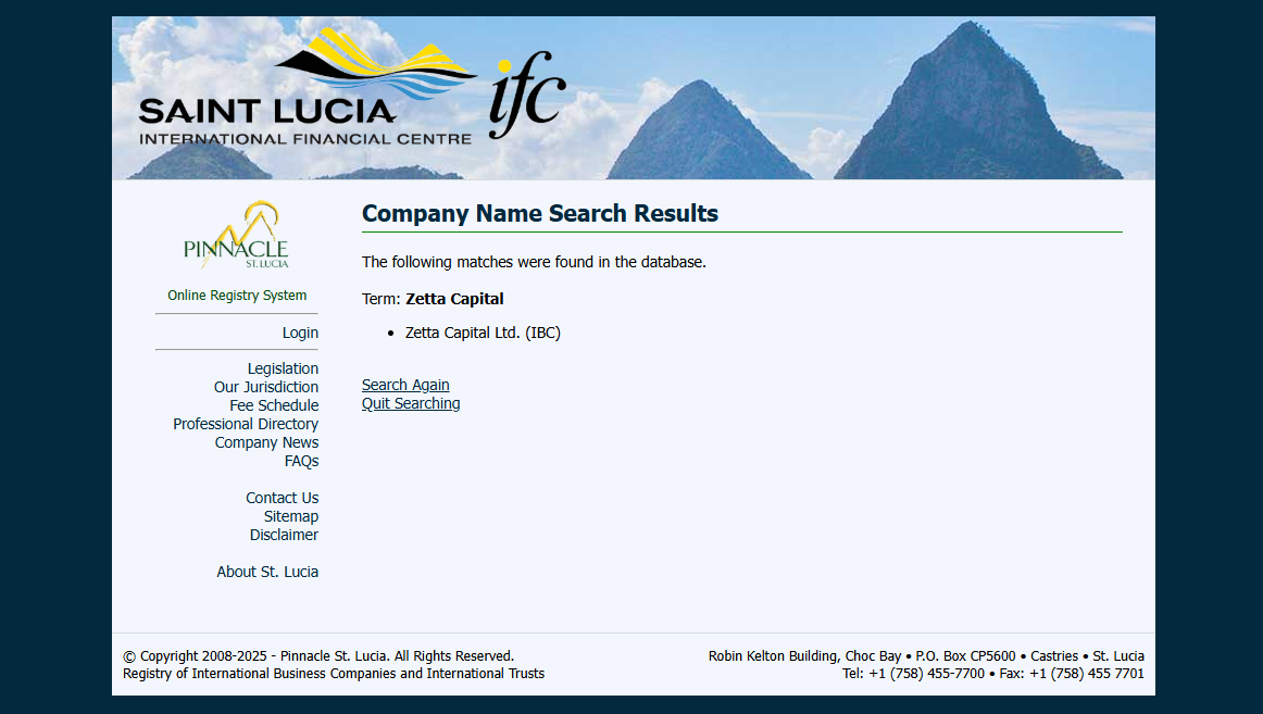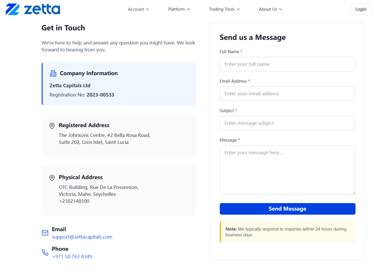 Zetta Capitals’ website provides no information regarding regulatory oversight. It only lists a registered address in Saint Lucia and a physical office address in Seychelles. We verified the registration of Zetta Capitals Ltd with the Saint Lucia International Financial Centre (IFC). However, this registration does not equate to a financial license, particularly for forex trading, as the Saint Lucia IFC does not regulate or authorize such activities.