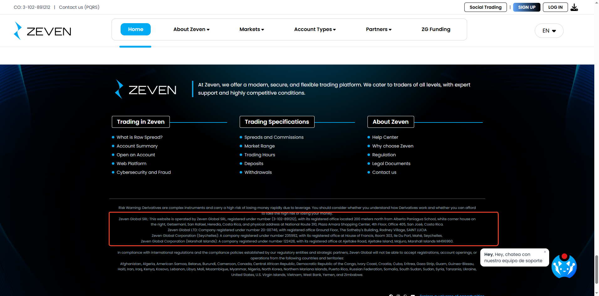 Zeven Global claims to be registered in Costa Rica and lists physical addresses in multiple jurisdictions, including Seychelles, the Marshall Islands, and Saint Lucia. However, Costa Rica does not have a recognized financial regulatory authority overseeing forex brokers, meaning that any forex-related activities conducted there are likely unregulated and not subject to formal licensing requirements.