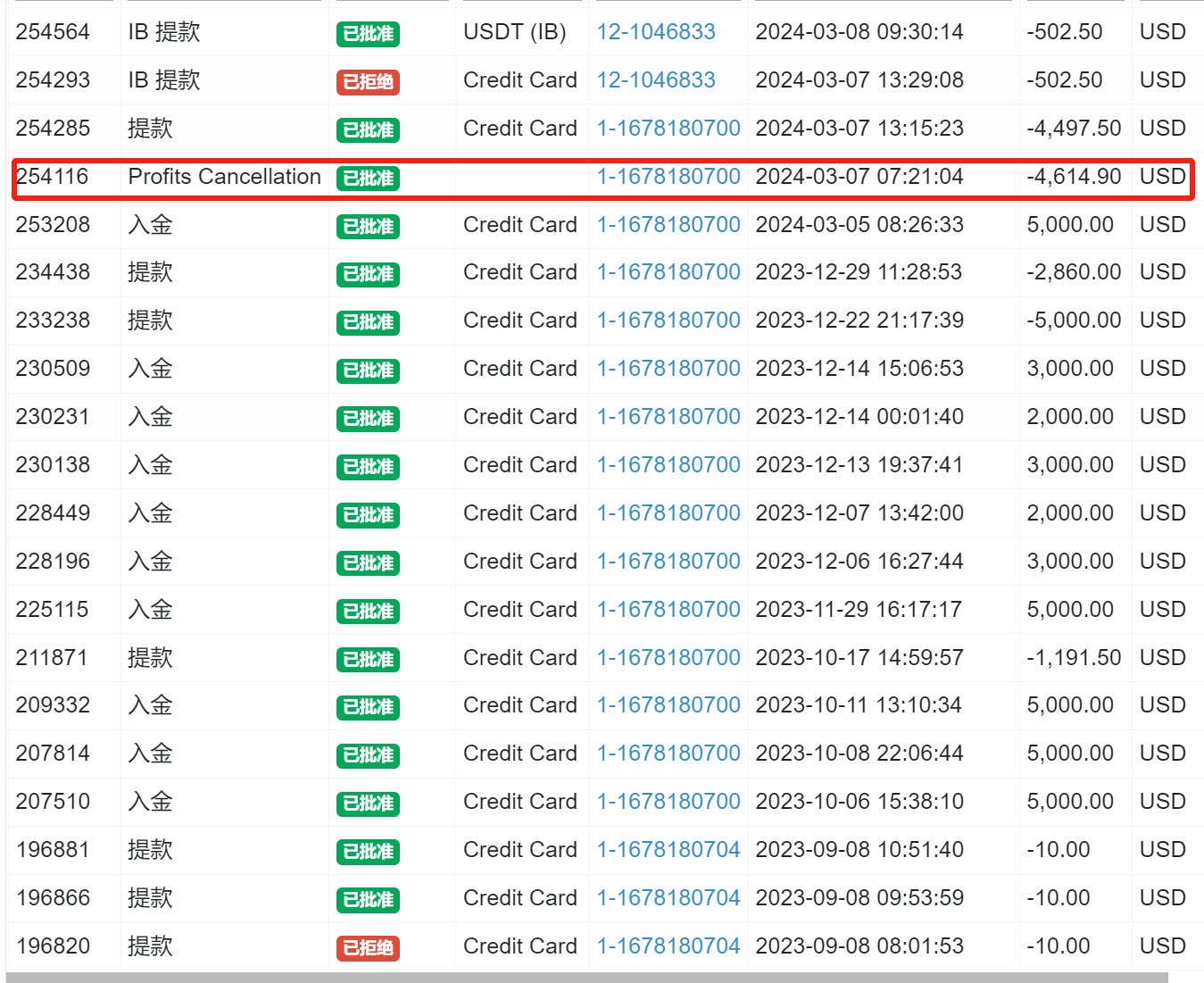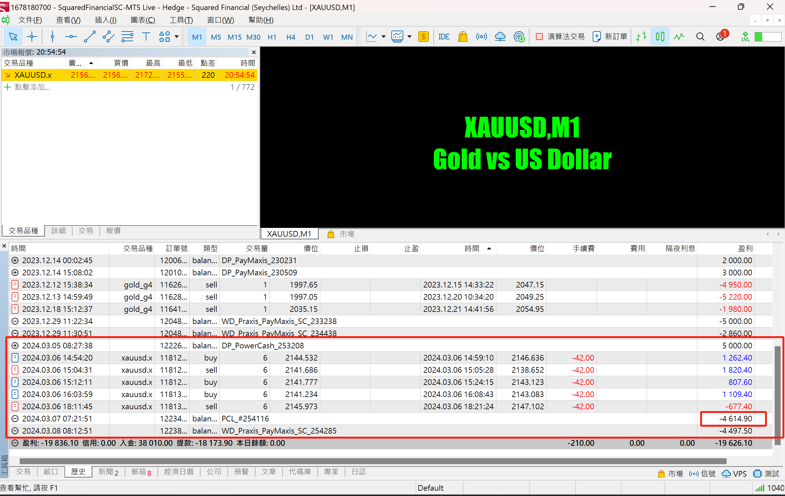 本人2023年8月在平方金融(Squared Financial)開戶交易黃金,自己交易一直虧錢,最後在23年尾出金打算不交易.隨後認識有老師帶交易黃金,所以重新在2024年3月5日入金5000美元.2024年3月6日老師便帶我們交易,玩了5次,4次贏,一次輸,共盈4112.4美元.但在2024年3月7日便給平方金融扣除盈利及返佣,共扣了4614.9美元.其他一起玩的朋友,在其他公司平台同樣交易,都沒事,只有平方金融(Squared Financial)扣除.找他們相關職員投訴,亦沒有回覆.最後只能無奈出金.