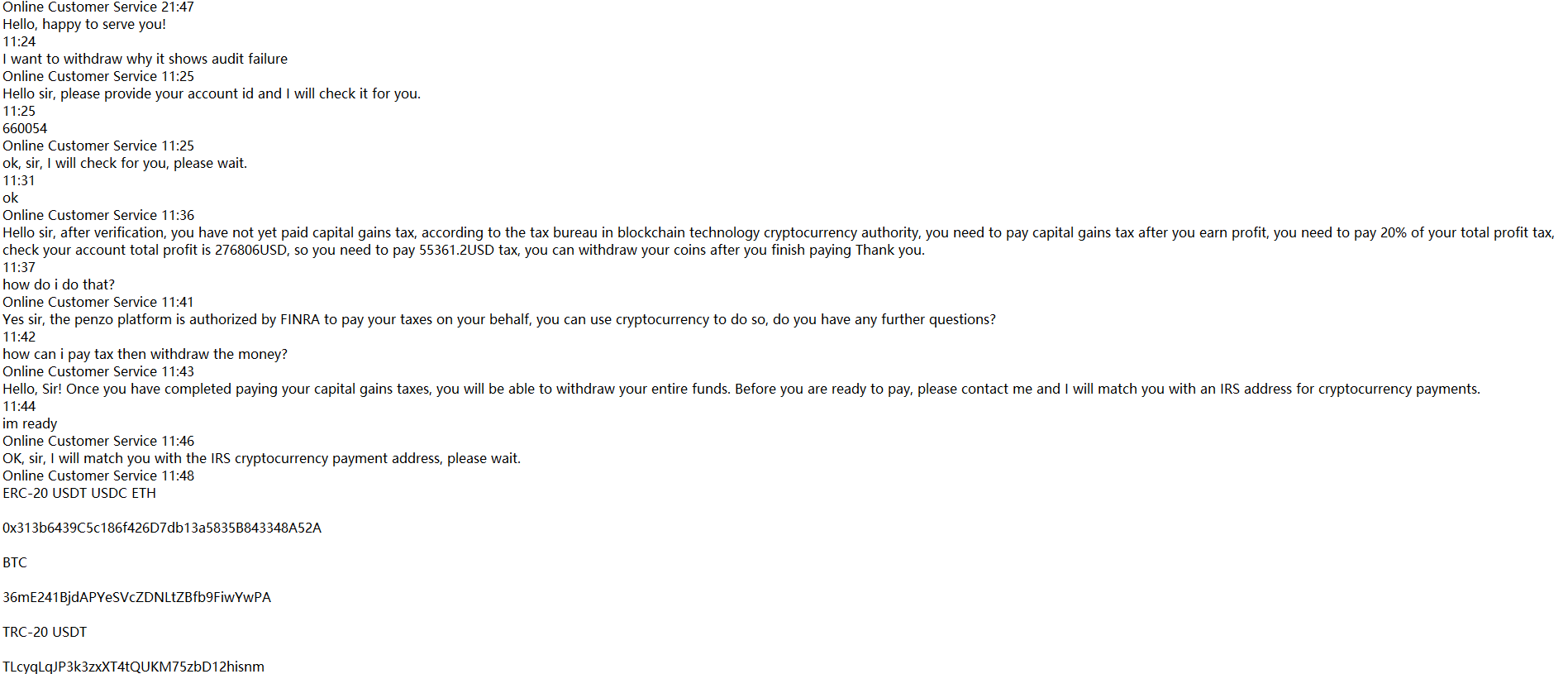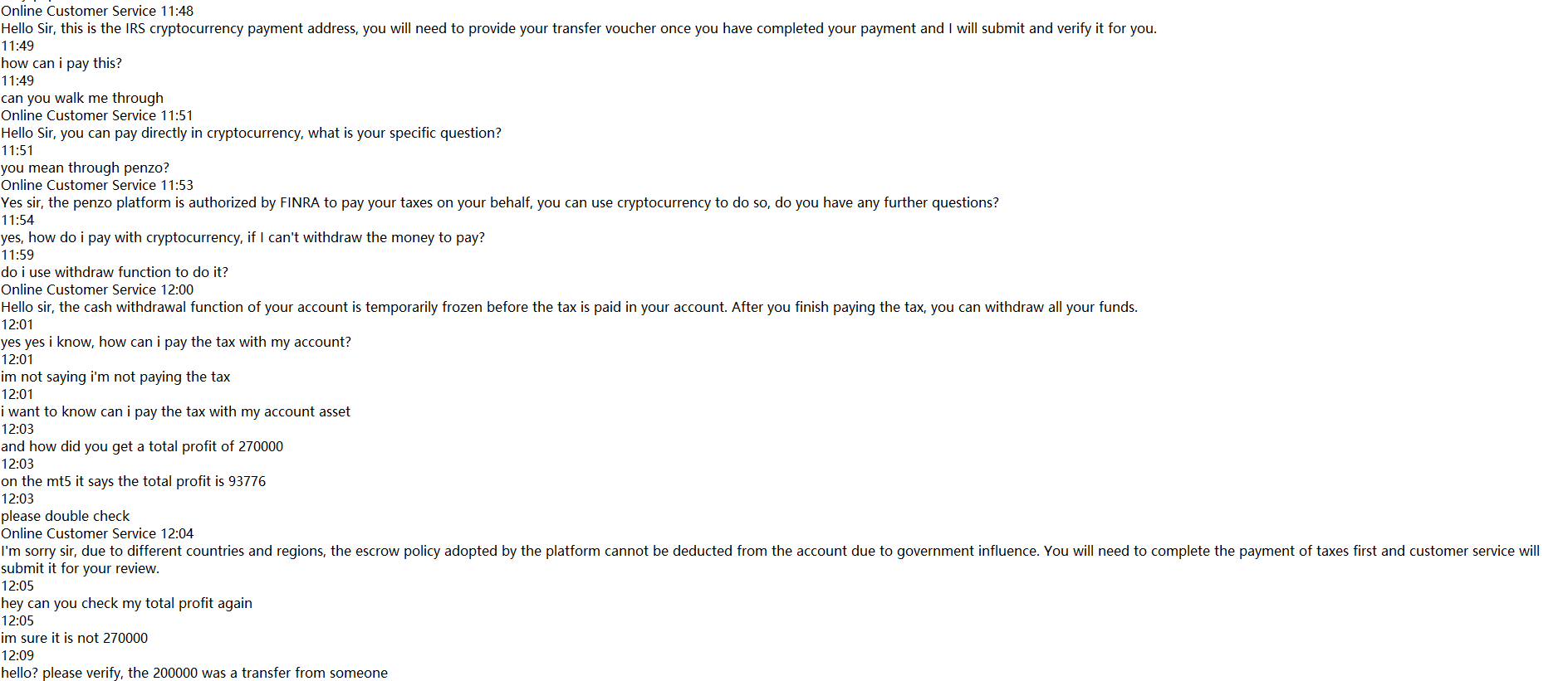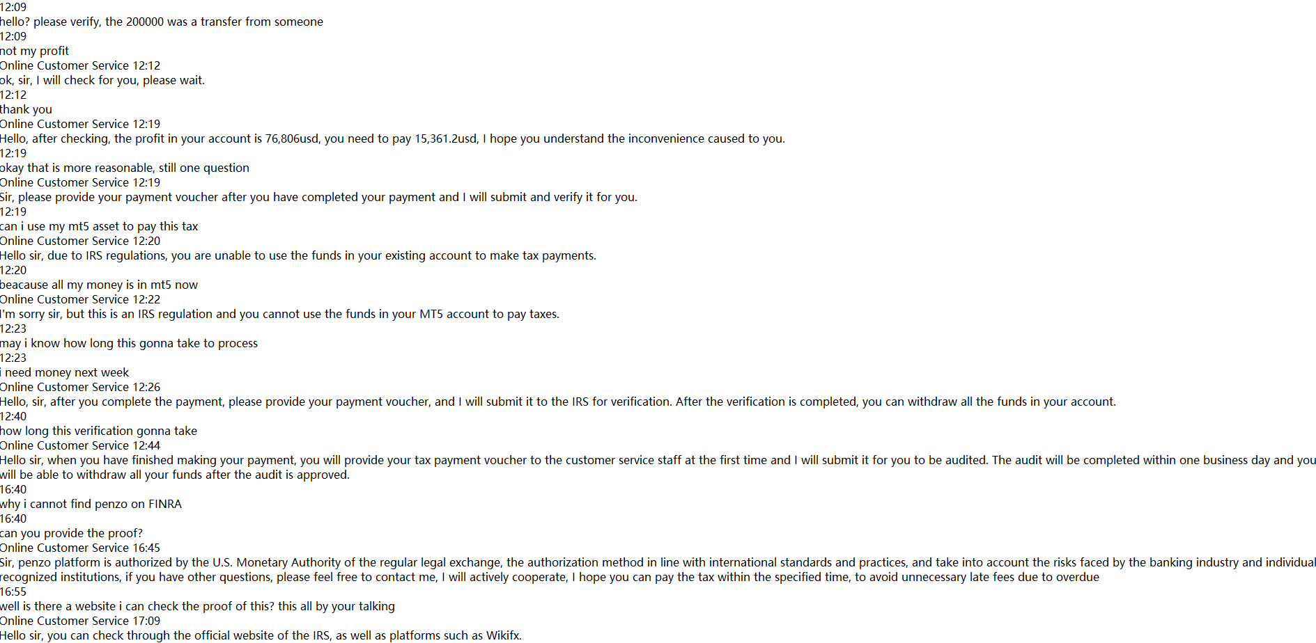 Hi, I tried to withdraw from Penzo Limited and they refused and said I need to pay capital gains tax before I can withdraw. They then sent me the IRS cryptocurrency wallet address claiming that I need to make a payment and send them the transfer voucher and that I can withdraw only after they complete the audit and approve it. First of all, I couldn't find any regulatory information for Penzo or any proof that they can collect taxes. Secondly, they say I can't use the money in my account to pay taxes, it has to be external, so why can't I use it when it's all my money? I have already complained to the police, I don't know what else to do, please help. So far I have lost $170,000.