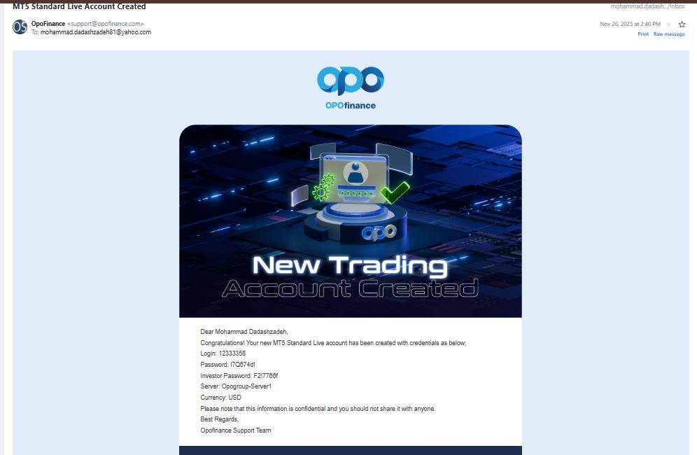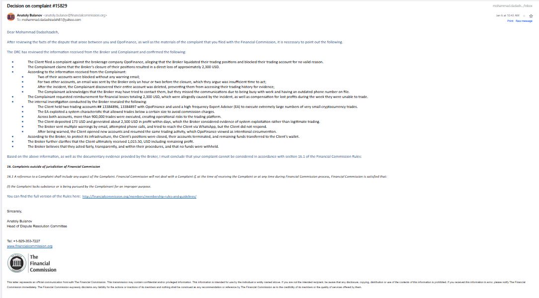 I complained to Finaccom, they told me that the reason opo Finance closed my trades was to protect their infrastructure, but they didn't tell me why I closed with a loss and didn't wait, Interestingly, Finacom, which claims to be an impartial institution, accepted the broker's word and no longer responded to my email when I objected to them. I am uploading the only email sent by Finacom.