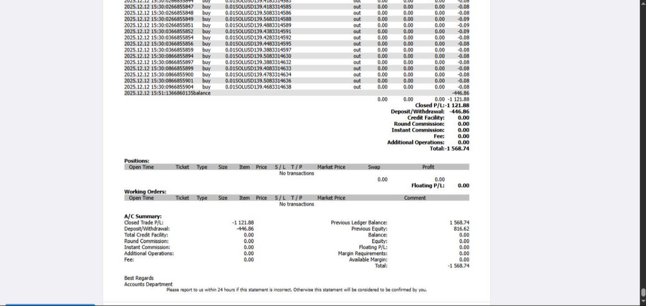 Hi, I was trading with a robot(bot trading in this broker is enable), it was making a lot of trades. I had made it for when I was away from the computer. Then I had a lot of open trades. Closing it caused me to lose almost $2300, plus the profit I could have made by that time, and the price moved in the direction I had predicted after my trades were closed by Oppo Finance. But they told Finacom that it was to protect the infrastructure, although according to the trading agreement, the robot is fine. They closed two accounts 12333358 and 12333329 without any prior notice (12.12.2025 at 14:49). Of course, they had sent emails to two other accounts 13384896 and 13384897, which I had not seen either. However, they did not send any emails to the two accounts that caused me losses, 12333358 and 12333329. and they had no logical reason to close my losing account and nonwait for the results to be known.