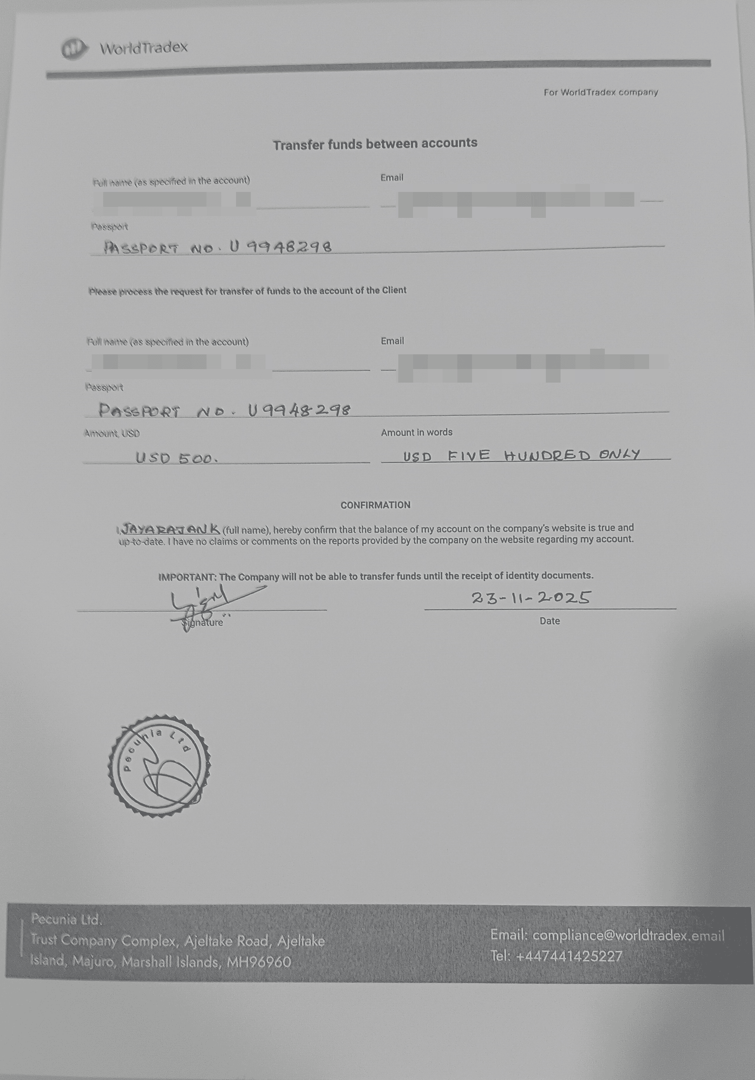 To achieve that level you have to deposit some more amount. I fixed that again I am trapped. Again I deposited INR 25000/-. She said now it is OK, don't worry, within six months this full amount which you deposited here, with profit I will send to your account. Every day I was in touch with my account. After 45 days on17.10.2025 my account reached a total of Usd 1747, then I called her and asked for a withdrawal from my account. She agreed and send me an account transfer form, to be signed and send back for the withdrawal.