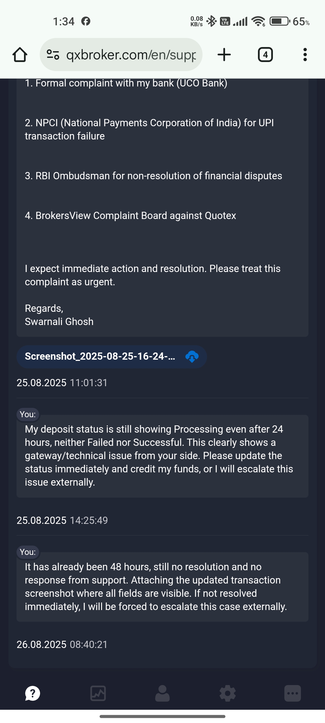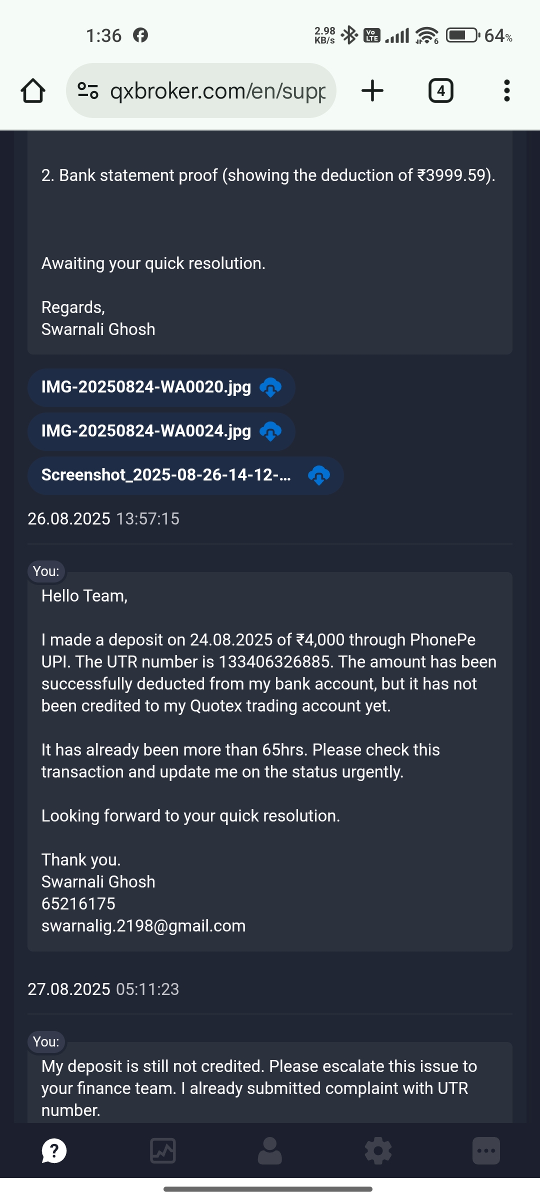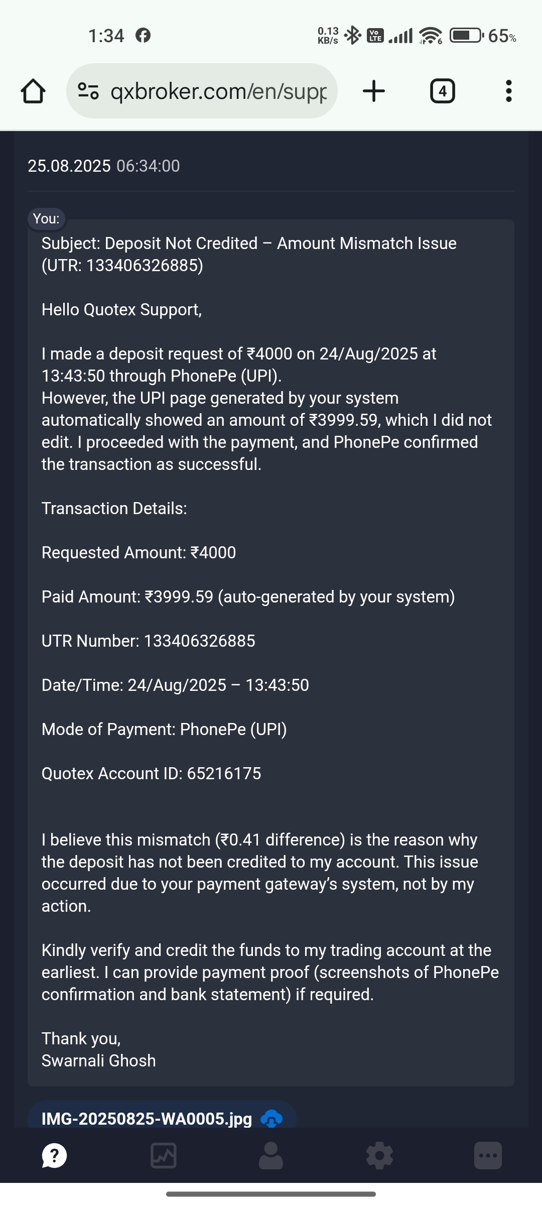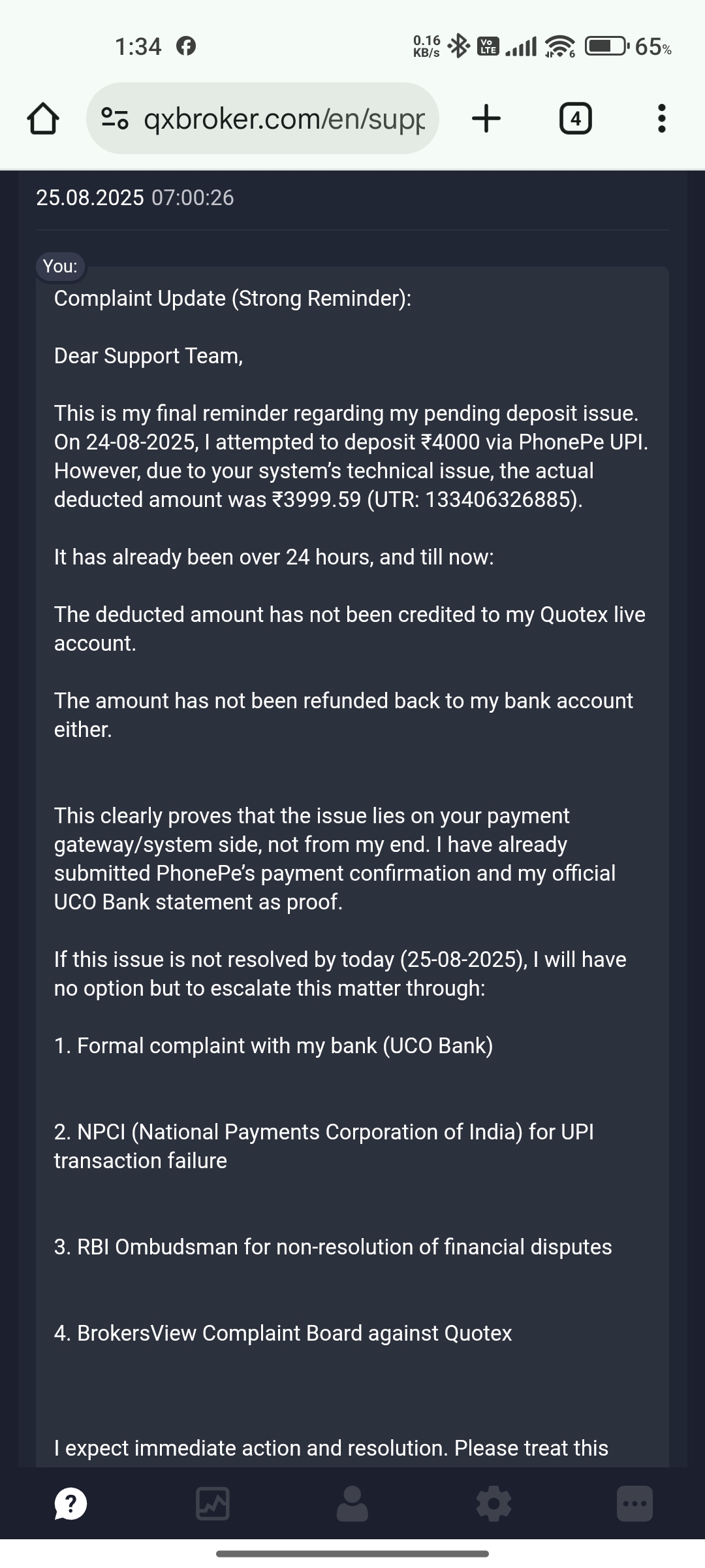 On 24.08.25, I attempted to deposit ₹4000 into my Quotex live trading account through UPI/Bank transfer.