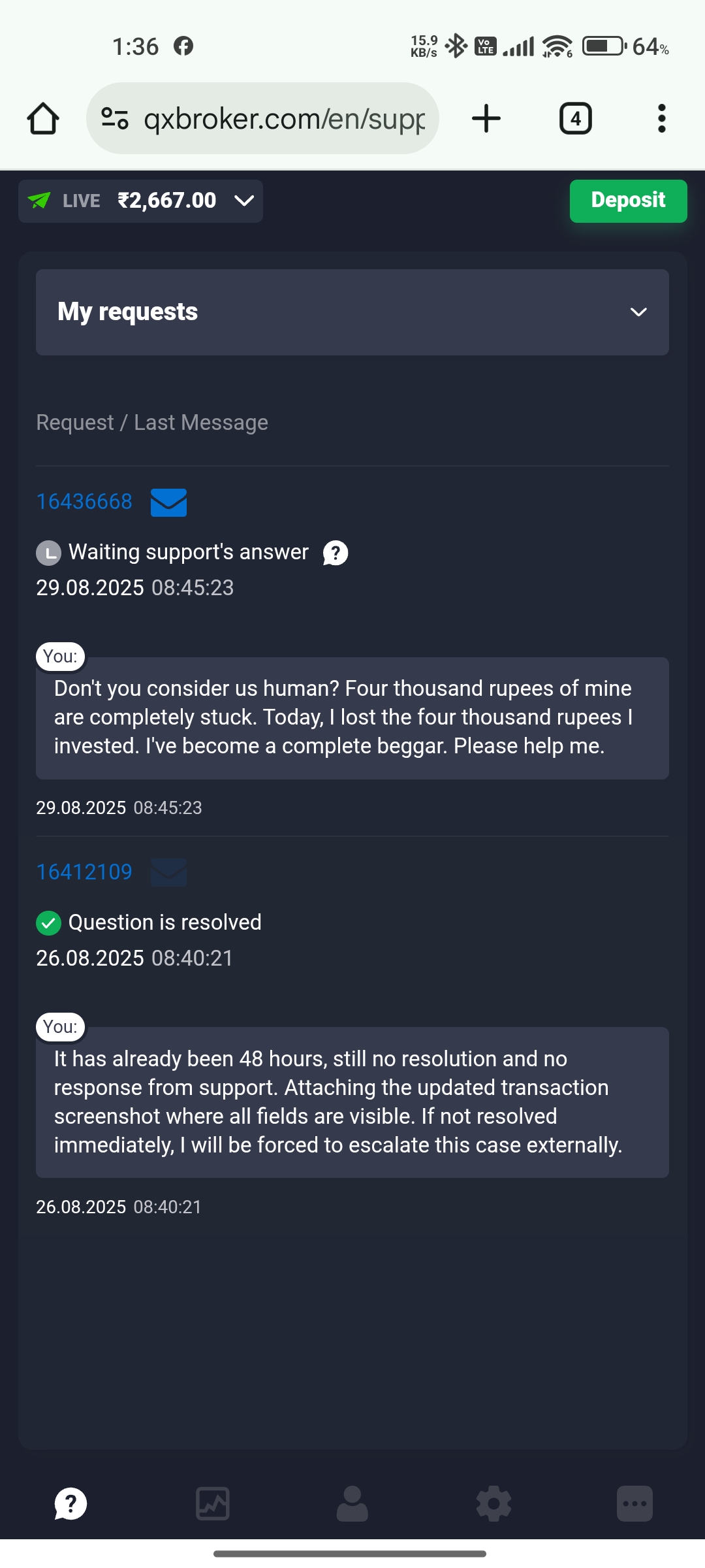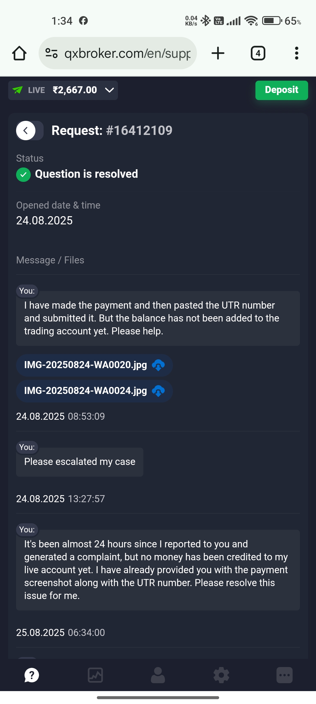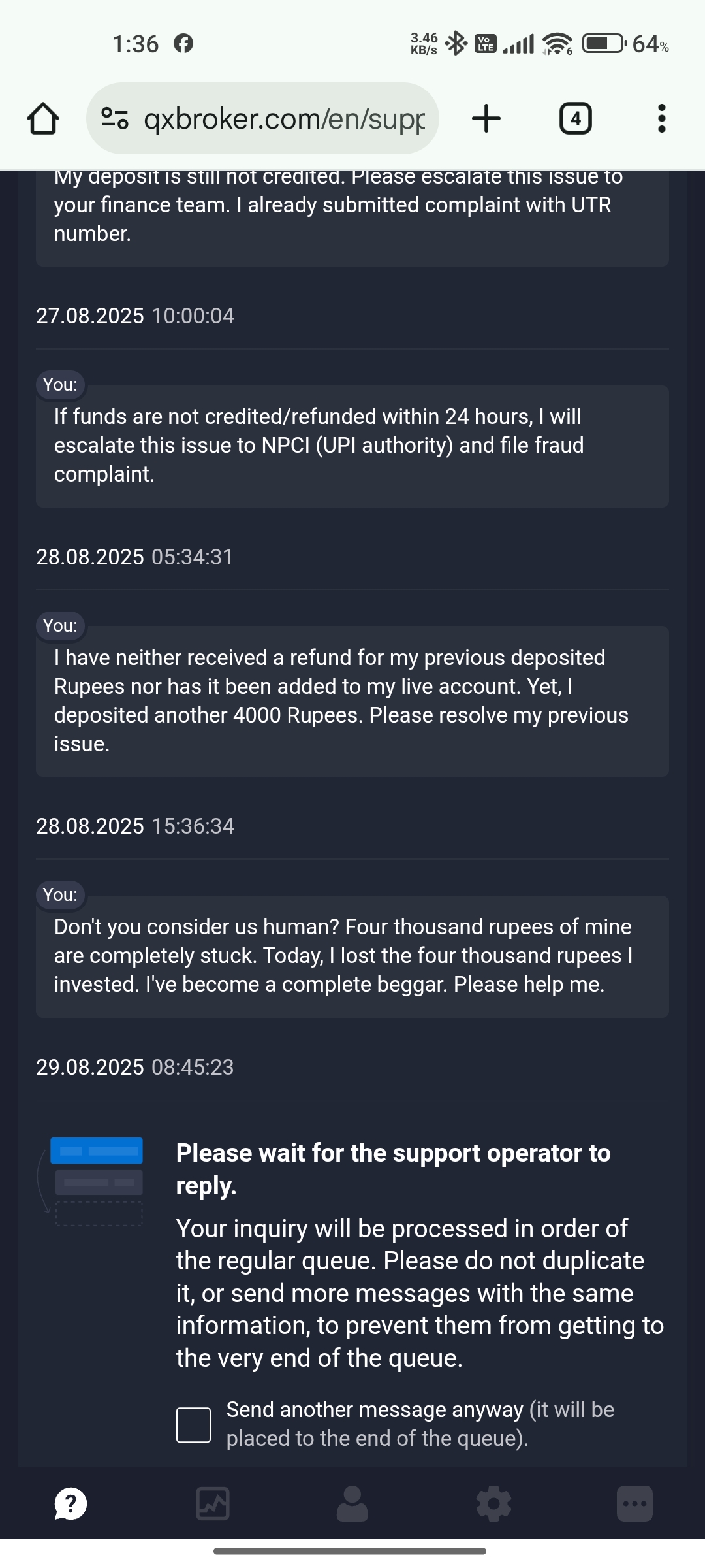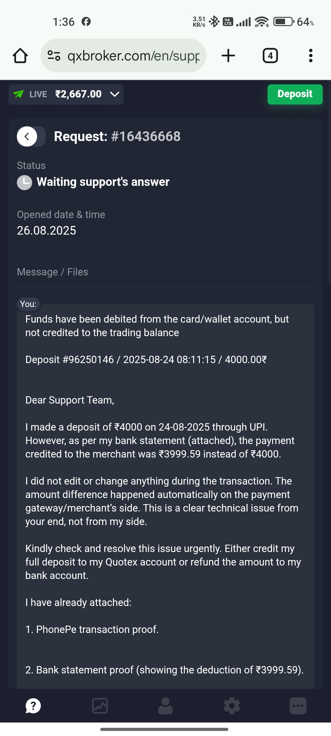 On 24.08.25, I attempted to deposit ₹4000 into my Quotex live trading account through UPI/Bank transfer.