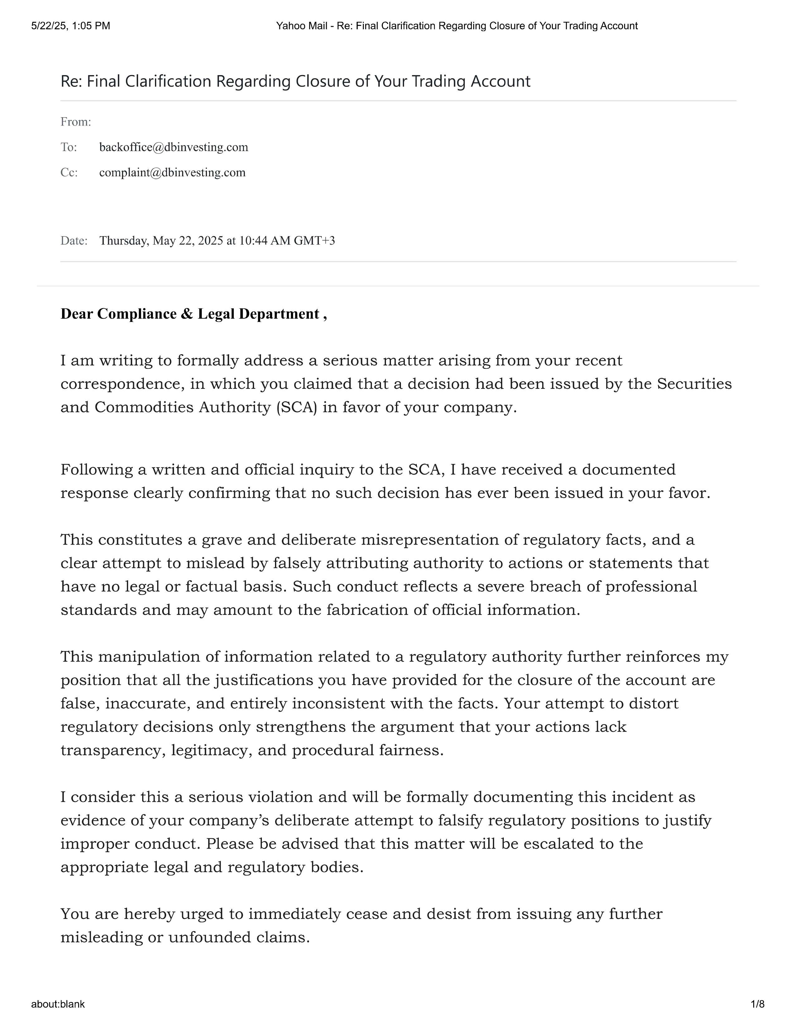 - The matter was escalated to the Securities and Commodities Authority (SCA), which, after reviewing the full documentation—including your transaction history, trade logs, and all correspondence—ruled in favor of DB Investing, thereby validating our decision and compliance procedures.