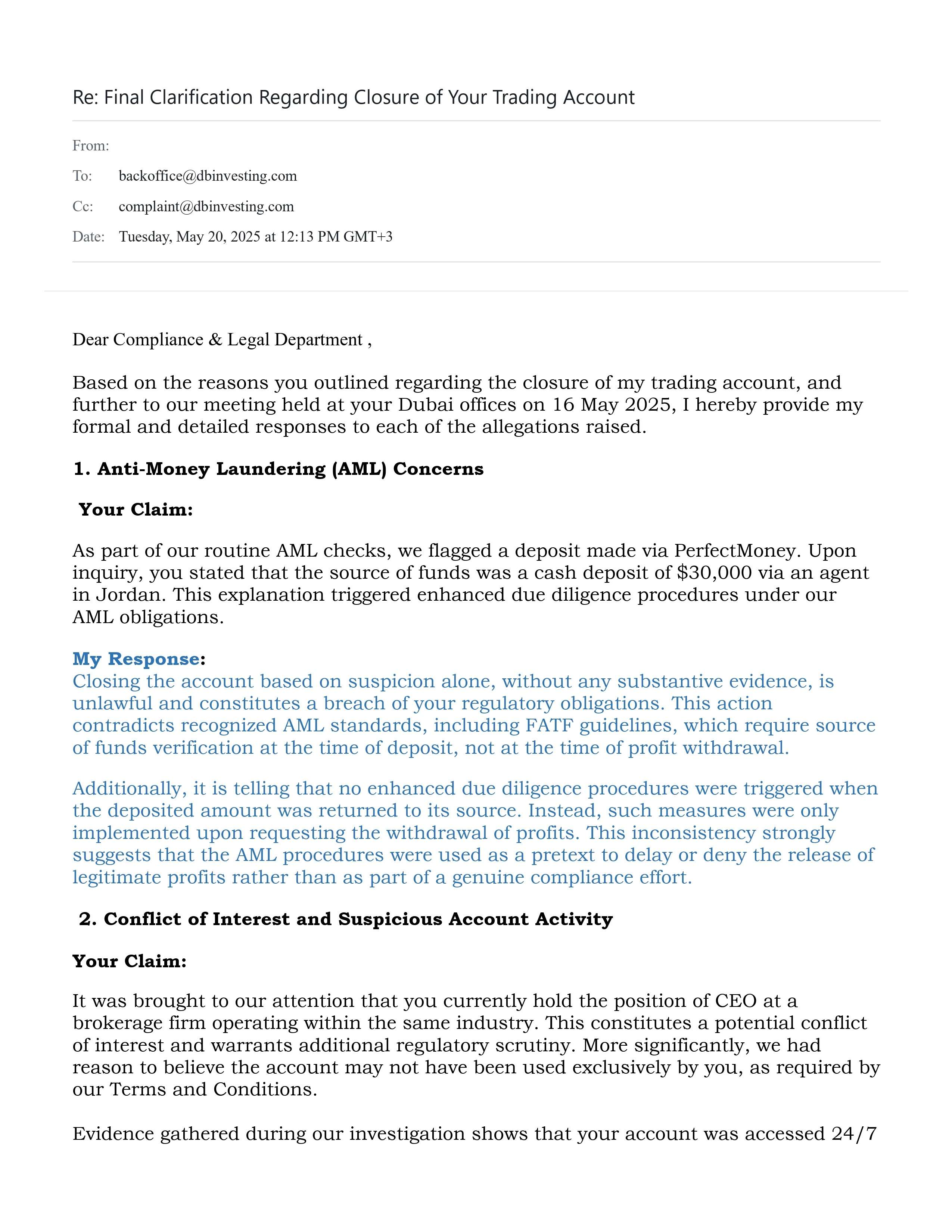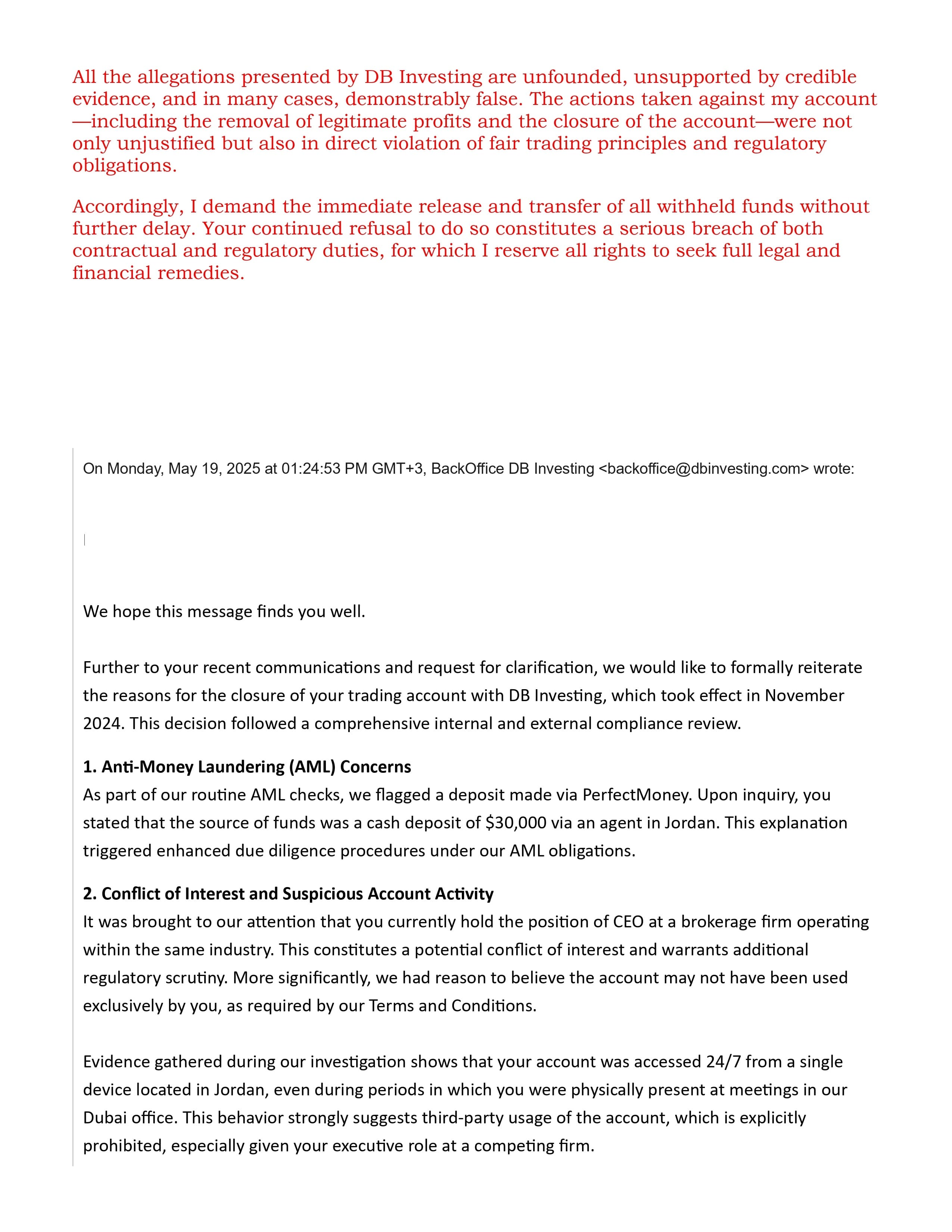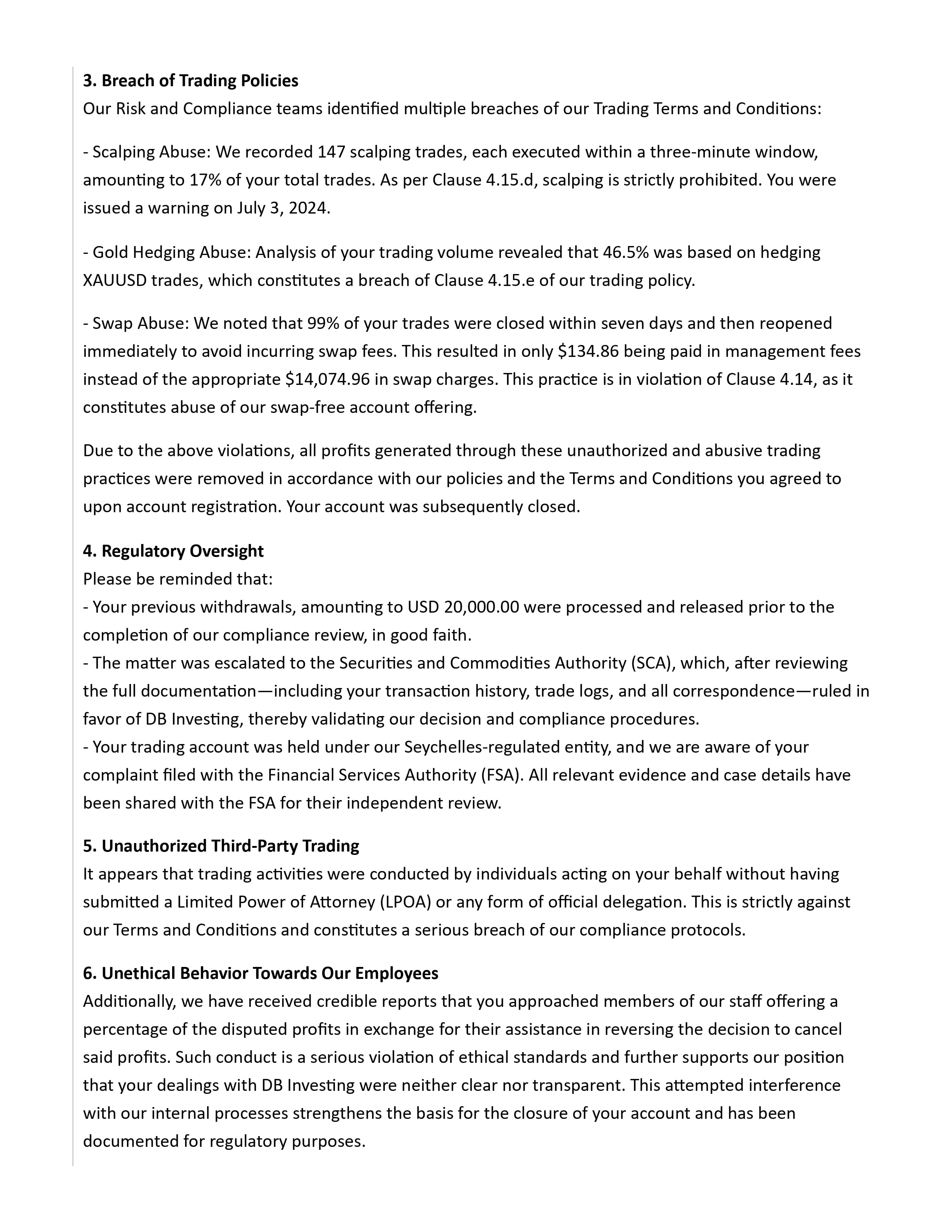Additionally, we have received credible reports that you approached members of our staff offering a percentage of the disputed profits in exchange for their assistance in reversing the decision to cancel said profits. Such conduct is a serious violation of ethical standards and further supports our position that your dealings with DB Investing were neither clear nor transparent. This attempted interference with our internal processes strengthens the basis for the closure of your account and has been documented for regulatory purposes.