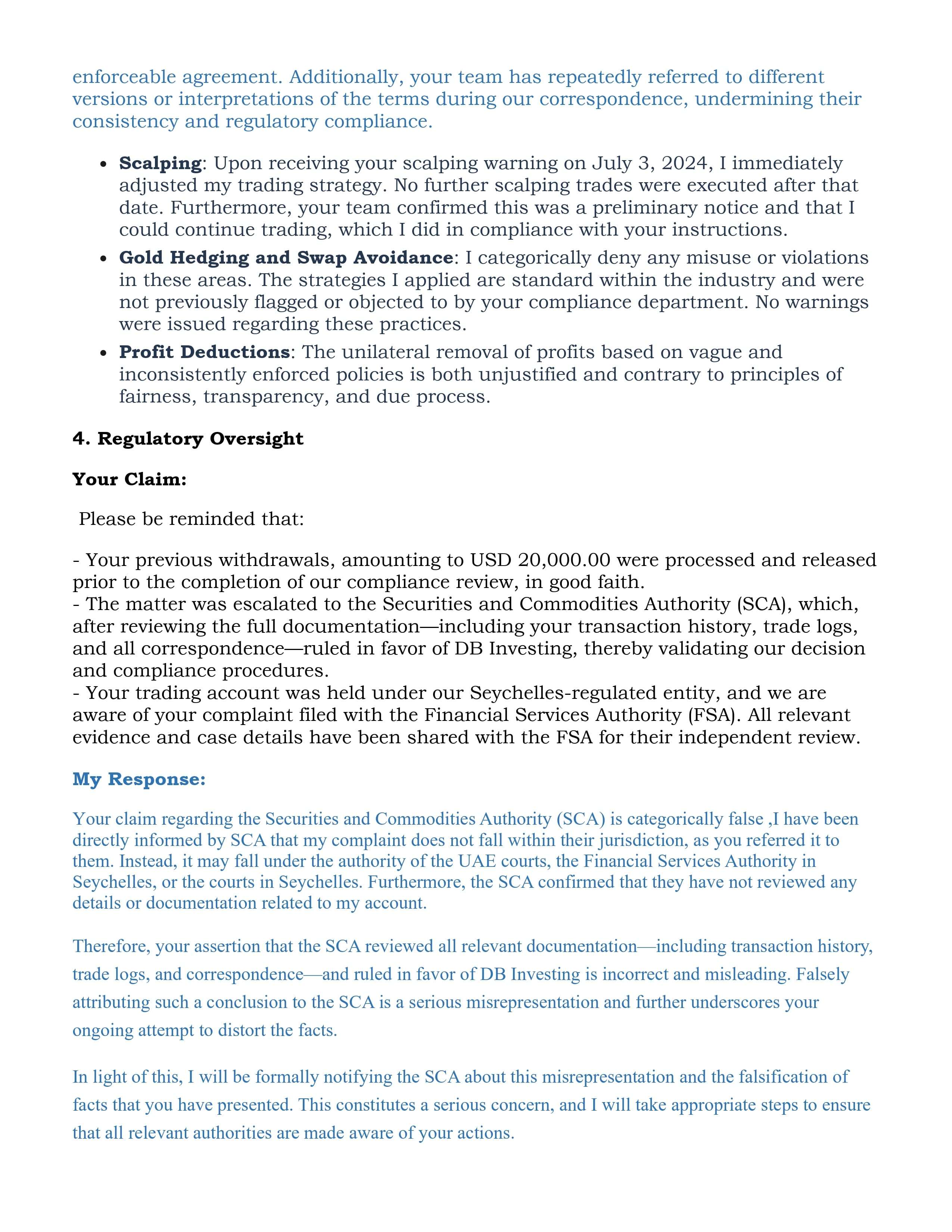 Therefore, your assertion that the SCA reviewed all relevant documentation—including transaction history, trade logs, and correspondence—and ruled in favor of DB Investing is incorrect and misleading. Falsely attributing such a conclusion to the SCA is a serious misrepresentation and further underscores your ongoing attempt to distort the facts.