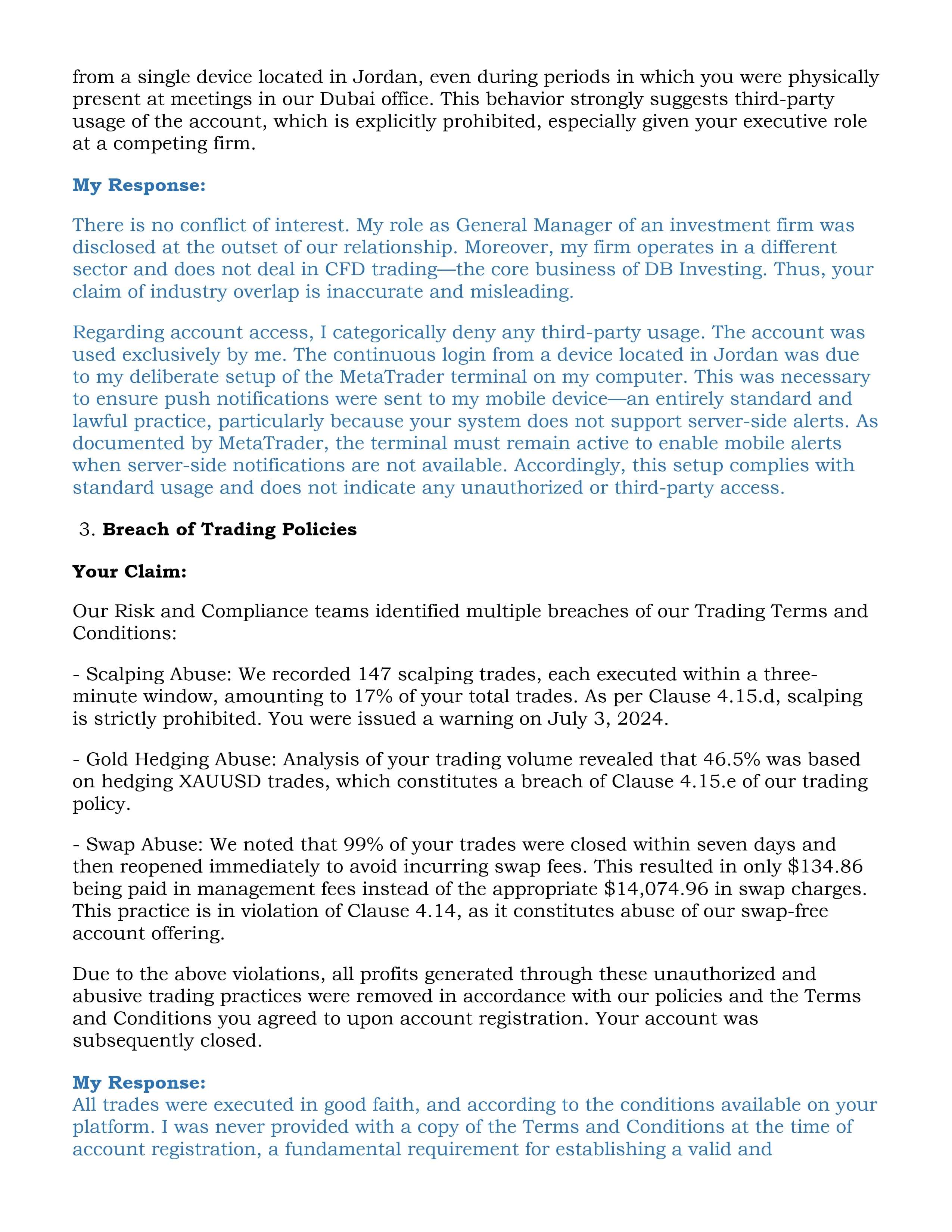 Making such serious and damaging accusations without concrete proof reflects your ongoing attempt to discredit me personally and distract from the central issue—the unlawful and unjustified withholding of my legitimate trading profits. I reserve all legal rights to pursue action in this matter and to escalate any further misrepresentations to the appropriate regulatory bodies.