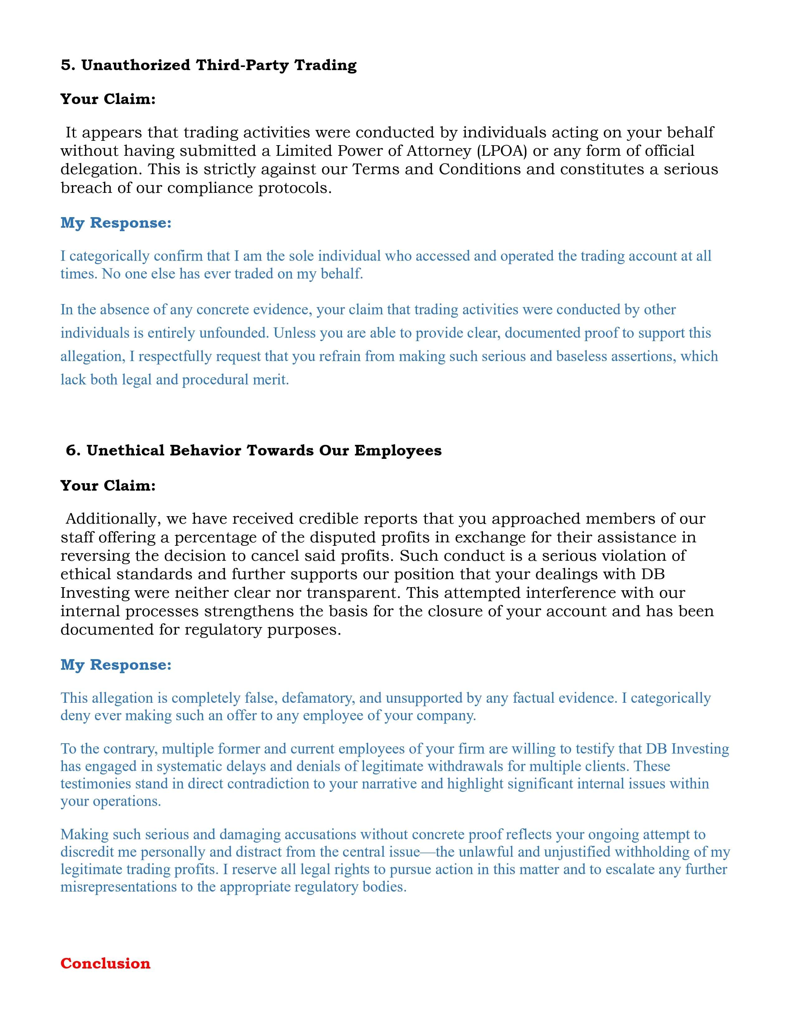 To the contrary, multiple former and current employees of your firm are willing to testify that DB Investing has engaged in systematic delays and denials of legitimate withdrawals for multiple clients. These testimonies stand in direct contradiction to your narrative and highlight significant internal issues within your operations.