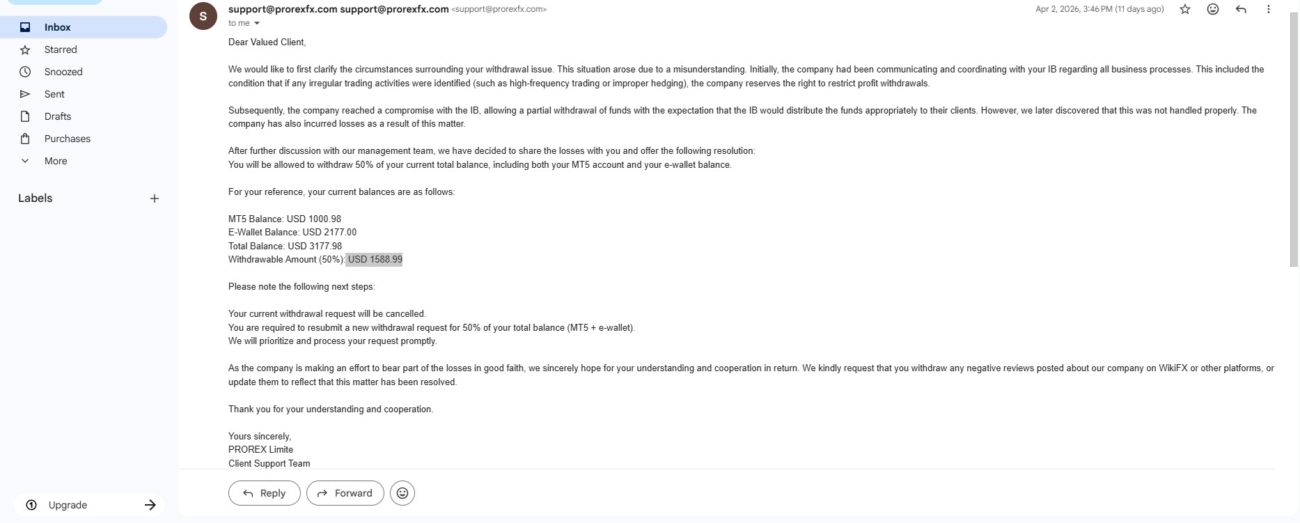 Following my public exposure of their misconduct on various rating platforms, the broker’s official support team (support@prorexfx.com) contacted me to initiate a negotiation. They formally sent a "Resolution Proposal" via email, committing to refund 50% of my equity (USD 1,588.99). However, this offer was conditional: I was required to immediately delete all my negative reviews on **** to "restore" their corporate reputation.