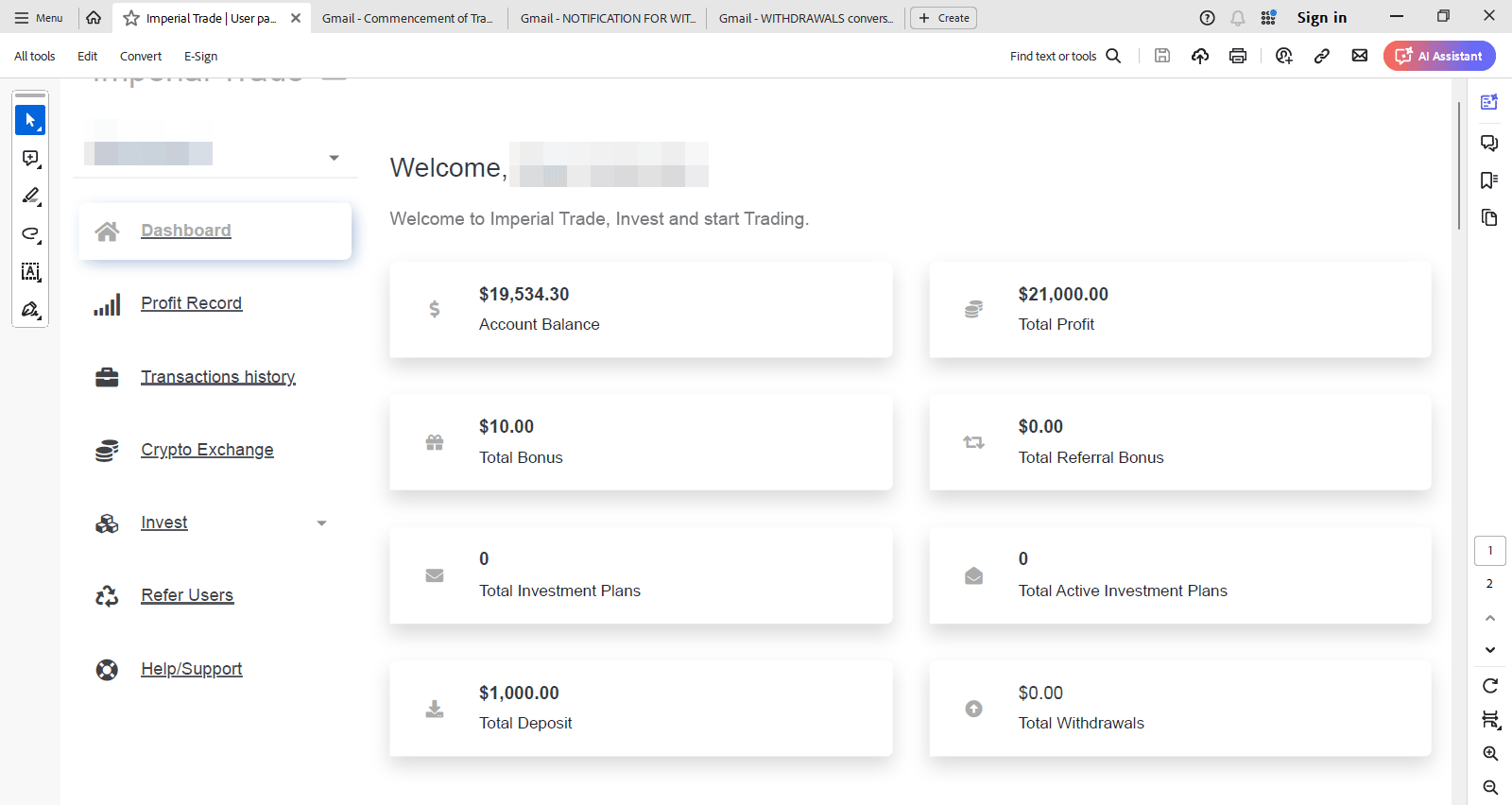 In January, I got a Telegram message from Jenny Harplers from Imperial Trade telling me about forex, crypto and bitcoin trading. She sent me the website link: https://usr.imperialtrade.live/login. After talking to her on Telegram, I registered on the website and on 0/15/2024, I sent $1,000.