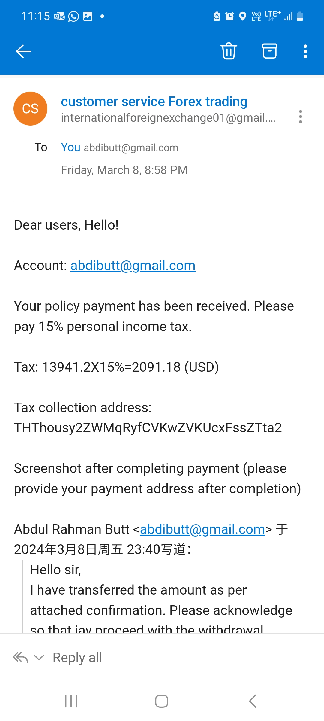 This is to inform you that i have been scammed by the trading App 'HERO MARKETS LTD' assessed through JSPRO Android app. I was approached by someone who called her name 'Ginney' having the cell # +852 6614 2256. She showed herself as an investor and declared that she made lot of profits from the trading app and insisted me to try as well. She trapped me through by giving a simulation account and guided how to use it. then asked me to start investment with $300 and took me to $4500 investment. Later, inclusive of profits I made $18,163/- and asked her for withdrawal. She connected me to a customer services email 'internationalforeignexchange01@gmail.com' which she has given me to verify my identity and ensure deposits in my account through Binance. Upon withdrawal request, she asked me to pay the analyst fee 20% '$2,788' first in account ID 'TJxYJsBMEX5ZEW5EXvcPR7NY7GtYU4X3Xy' before we proceed your withdrawal. When I completed the transaction then she asked to pay the Income tax of 15% '$2091' to get the payment. I paid and still waiting for the withdrawal. I processed the withdrawal through the app later on 09-03-2024 and its showing 'Pending Review' since that day and nothing proceeded. Now, the lady from above given number has blocked m
