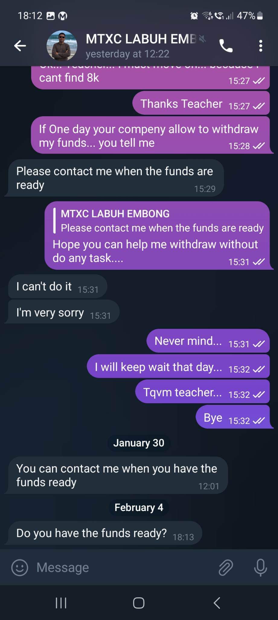 So I invested again. After that, they asked me to invest again and again .... , but I still can't withdraw my invested money. I asked them to get my investment money back for me but they asked me to invest again ......
