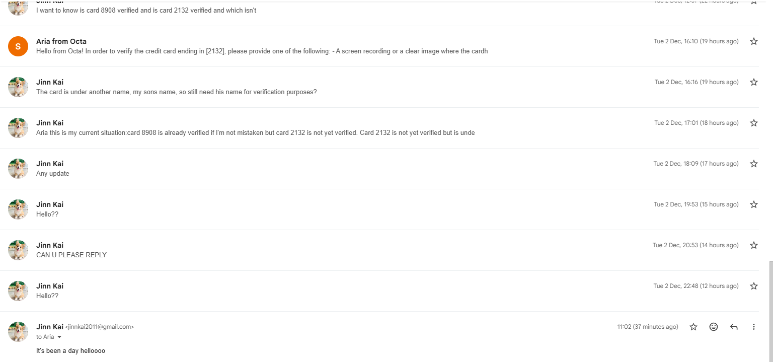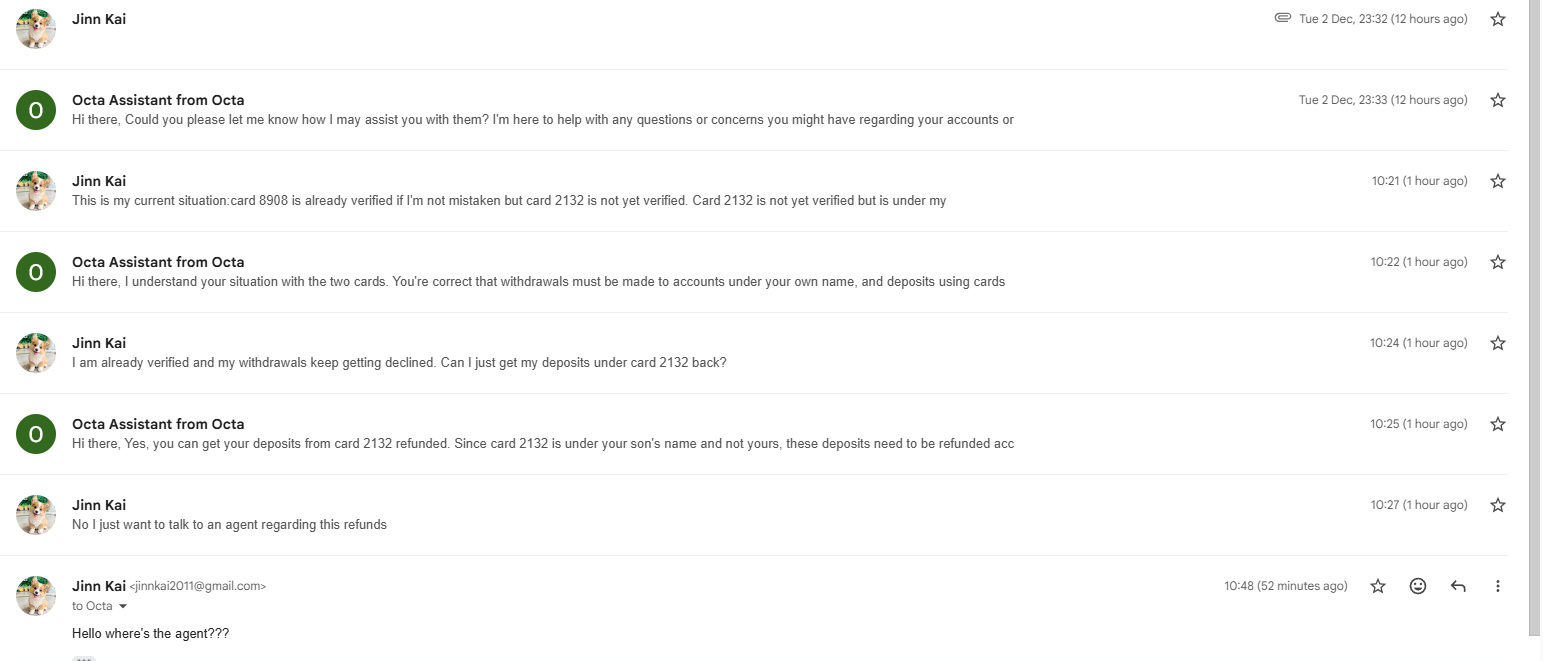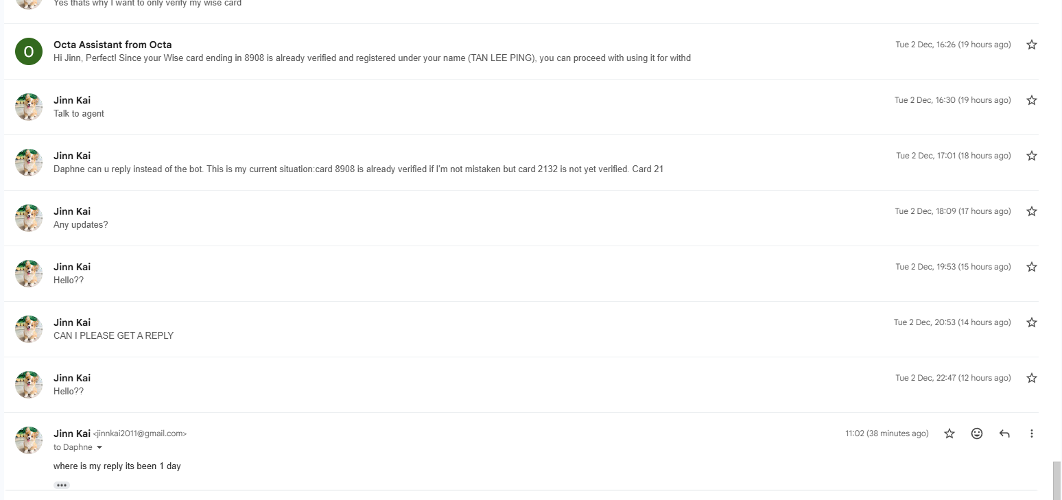 i wanted to make a withdrawal totalling to USD224 with my wise visa card but i deposited twice with a card not under my name. that was my mistake but their customer support is not helpful and doesnt actively cooperate with me. after that, my wise visa card got verified and i still cannot withdraw my funds. i told them the first visa card not under my name is not needed for verification because i will not use it for depositing or withdrawing and now they dont respond to my emails. this is my octa account number is 102814262