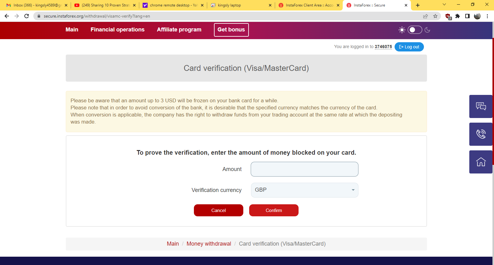 I think that i may be scammed by instaForex. I try withdrawing my money the system keep asking me to verify my card over and over and each i verify 3$ is frozen in my bank card