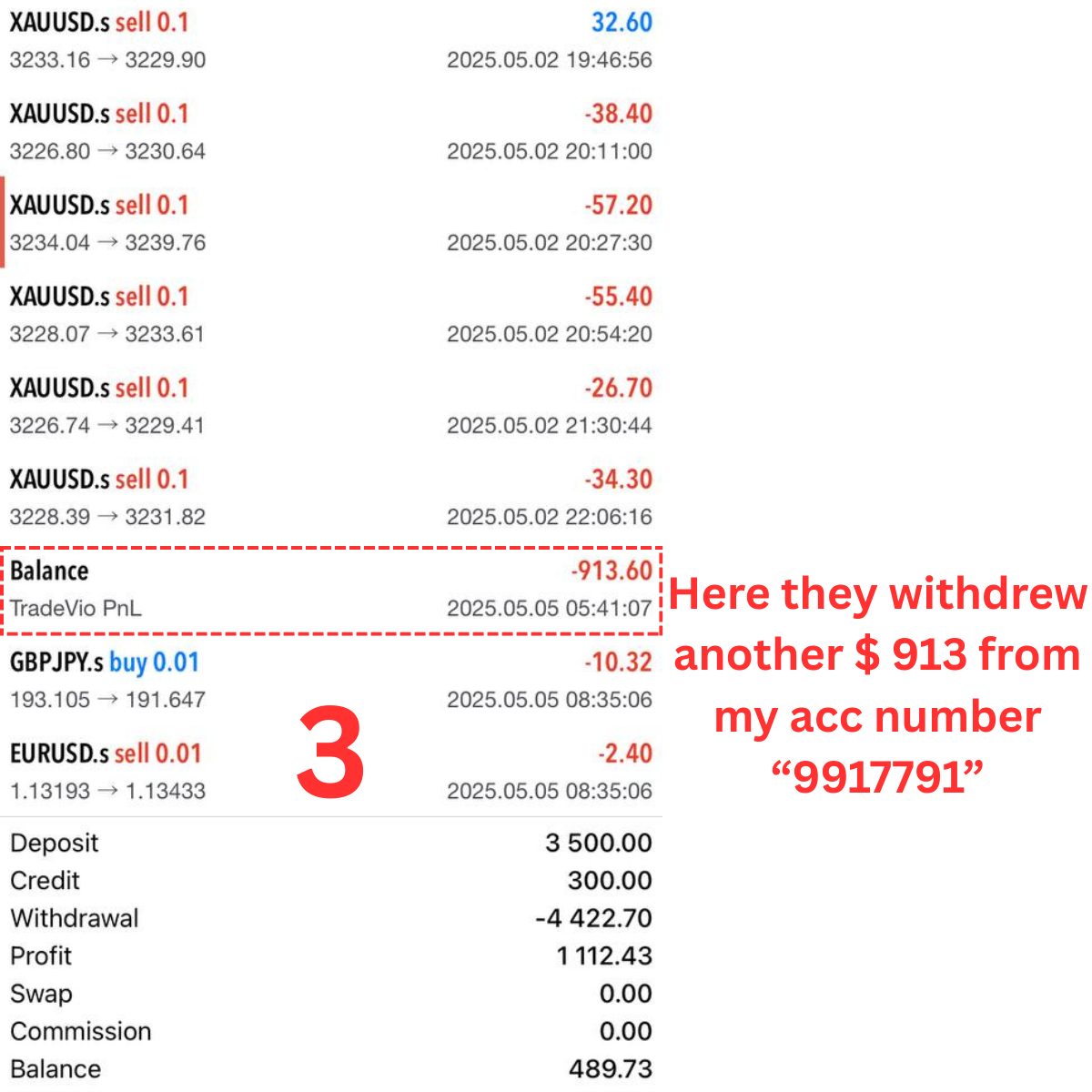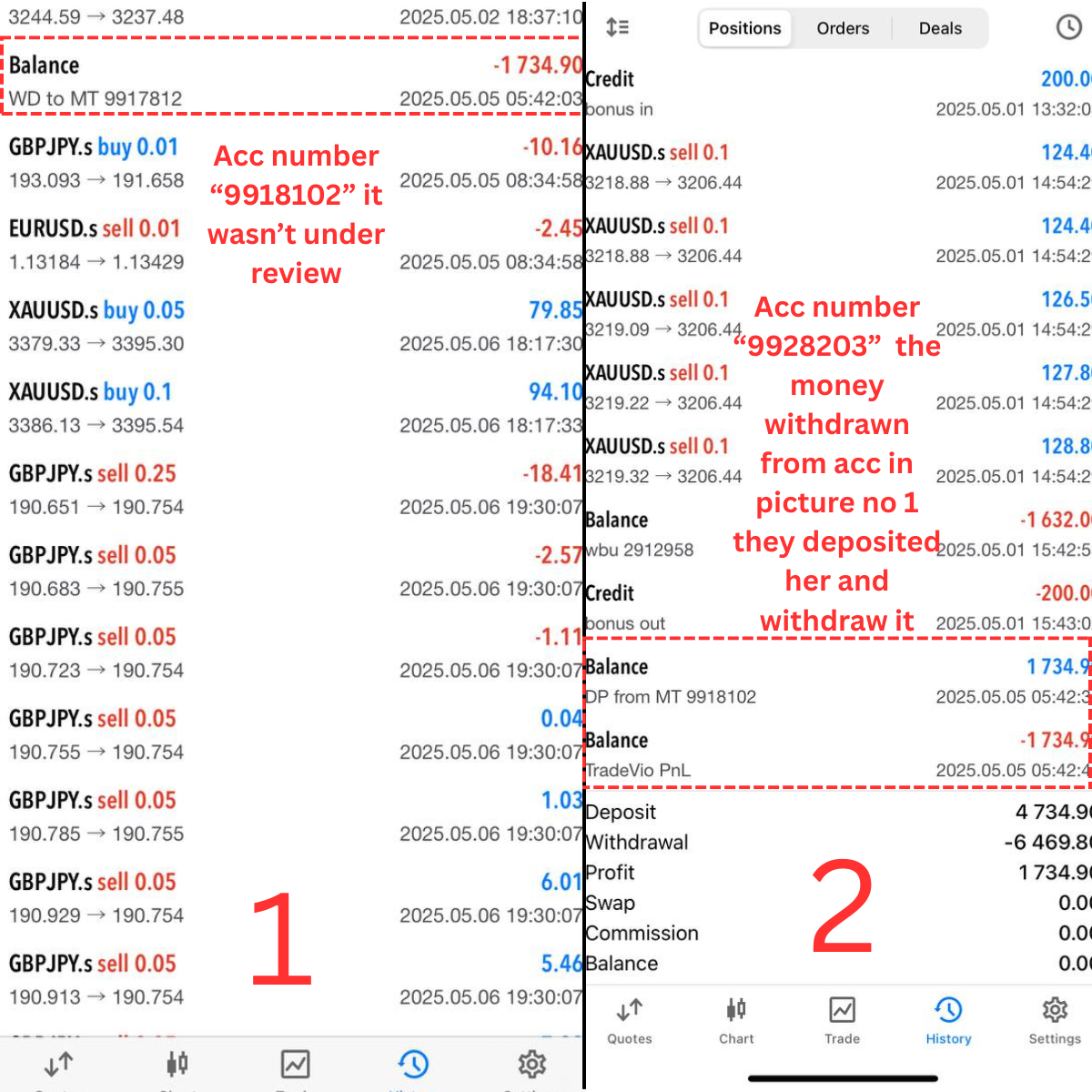 Despite this, just two days later—on May 5—funds were deducted from my account (account number 9918102), amounting to $1,731, with a transaction labeled “WD to MT 9917812.” This account wasn’t previously flagged as under review. Additionally, $913 was withdrawn from another account (9917791) under the label “TradeVIo PNL.”
