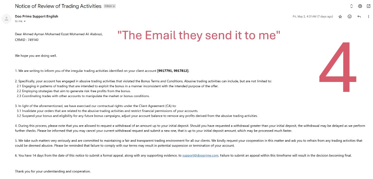 On April 30, I attempted to perform an internal transfer to continue trading using only my profits—a method I follow to minimize risk. However, I received an error stating “this operation is not allowed.” That same day, I was informed via email that my account was under review for what was described as "illegal profit generation," and that no action would be taken for 14 days.