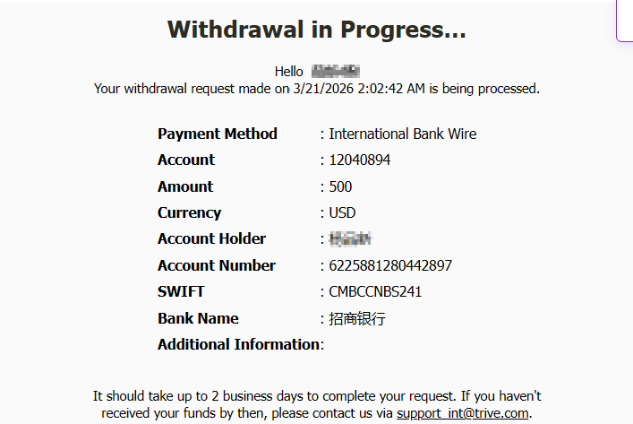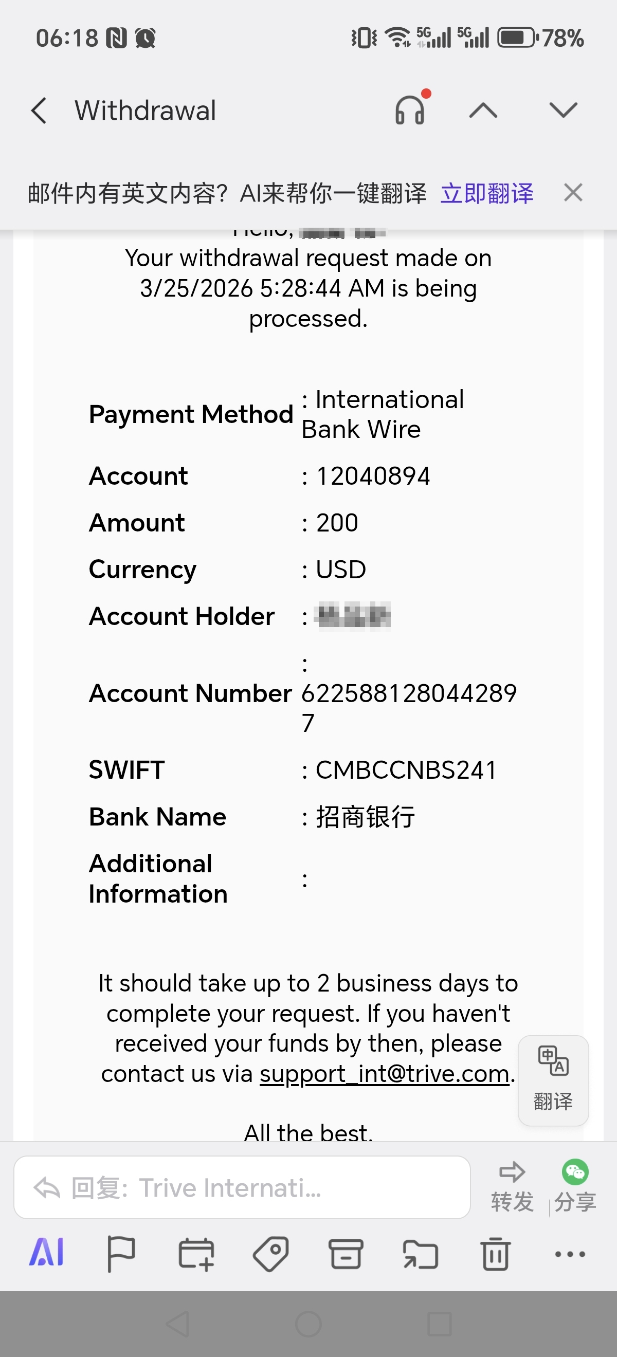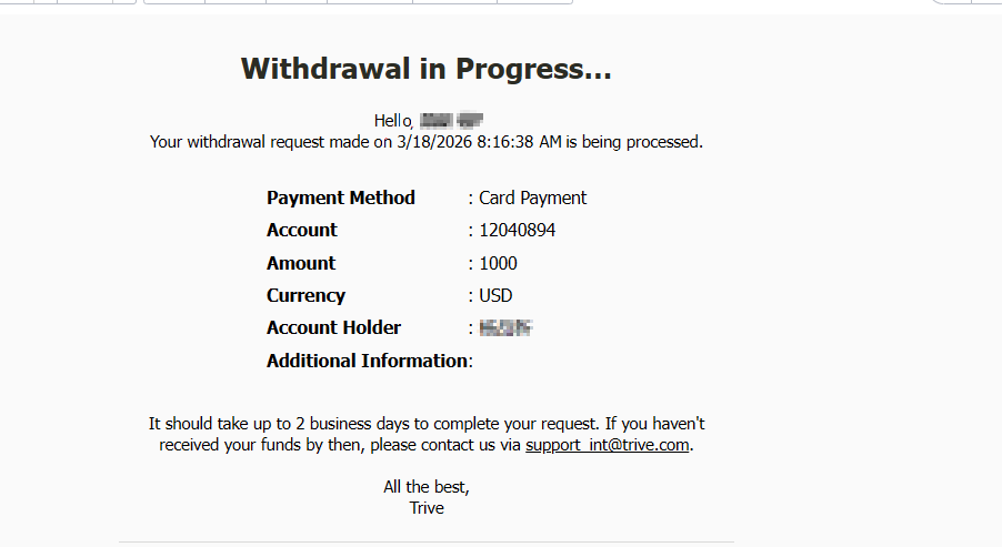 I first requested a withdrawal of $1,000 on March 18th, and was notified by email that the withdrawal was successful, but the funds have not yet arrived in my account. I've made several more withdrawal requests since then, all of which have failed. Trive only replied to my email once, saying that the $1,000 withdrawal was in progress, but later requests to withdraw $200 also failed. They haven't responded to my emails either.