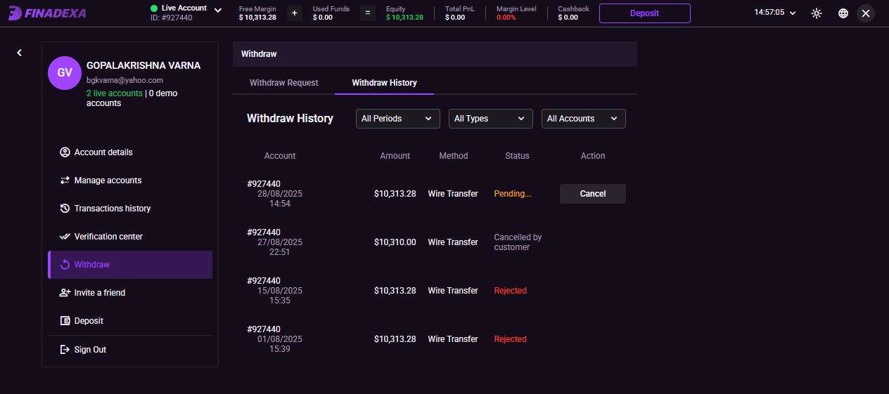 I joined the FINADEXA trading platform in Apr 2025 and invested around $6000. I am not happy with them. I want to withdraw my investment and close my account. But my withdrawal request is rejected every time without giving any valid reason. They call me and pressure me to continue trading. This has been going on for the last two months. I think they will continue dragging like this and will not return the investment. I would like to take up this issue with the appropriate authority and get back my investment. I hope you to be helpful to me. Thanks