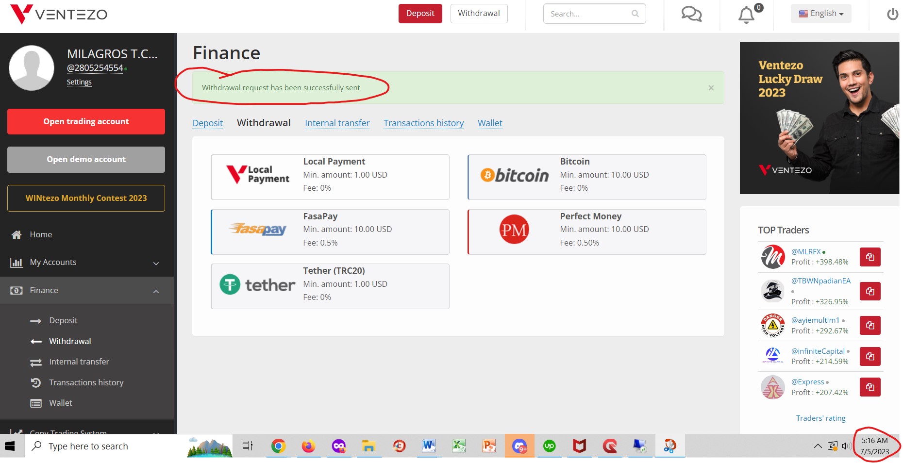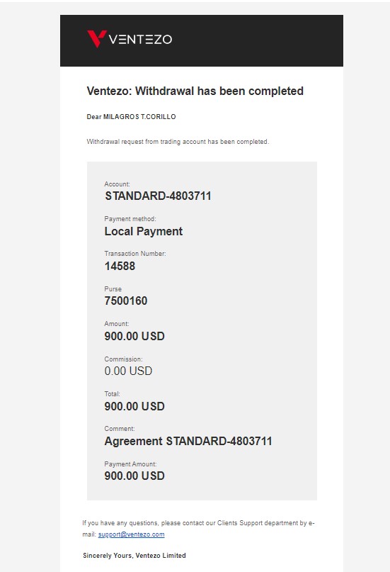 1. Withdrawal Issues:The said account holder my mother, have been facing non-release of her withdrawn funds.Despite receiving official email confirmations from Ventezo stating that the withdrawal requests have been completed, the funds remain unreleased.