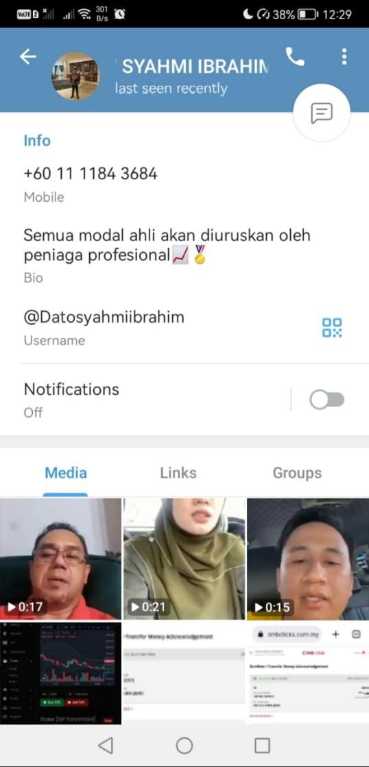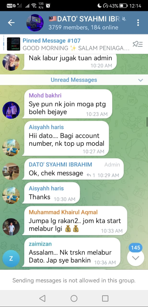 I was added into a Telegram group by random people. I never change my Telegram setting for group invitation. So, I just play along and watching what happened in the group day by day. They shared profit from investment until one day I was interested to join. I deal with one of the admin in the group and begin with the basic plan which is 1,000 MYR. After payment by payment, I already transferred about 30K MYR and the latest need to pay another 15K MYR but I DONT have money left.