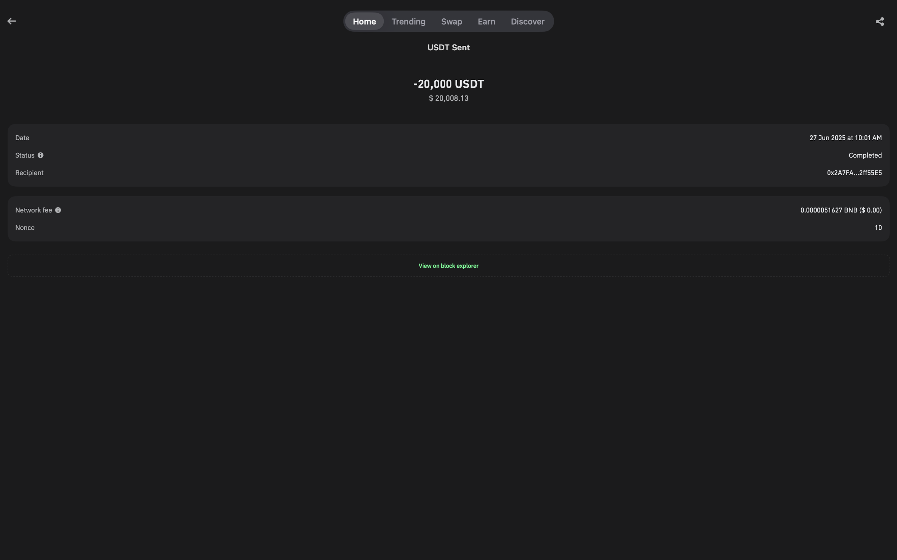 - Deposited $20,000 on [27-06-2025] (TX: check) https://bscscan.com/tx/0x5c4602e3a6d79bbe87ece13a1f0ab435eb5e38179ca2b769ab9b246c9e90d763
