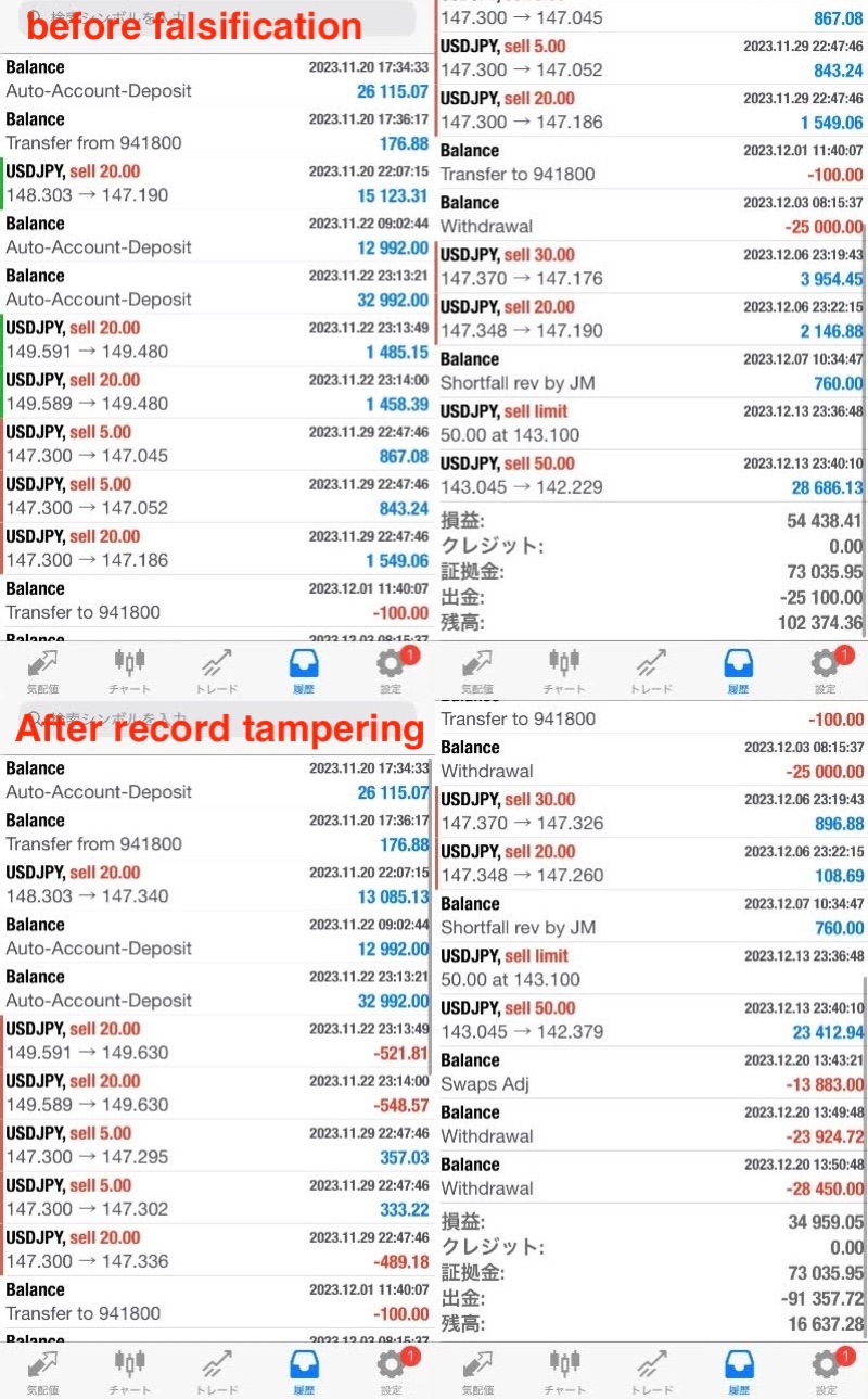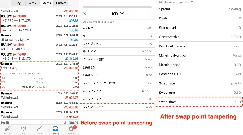 Due to improper falsification of transaction records and improper swap collection, a withdrawal (US$35,450) due to profit cancellation was denied.