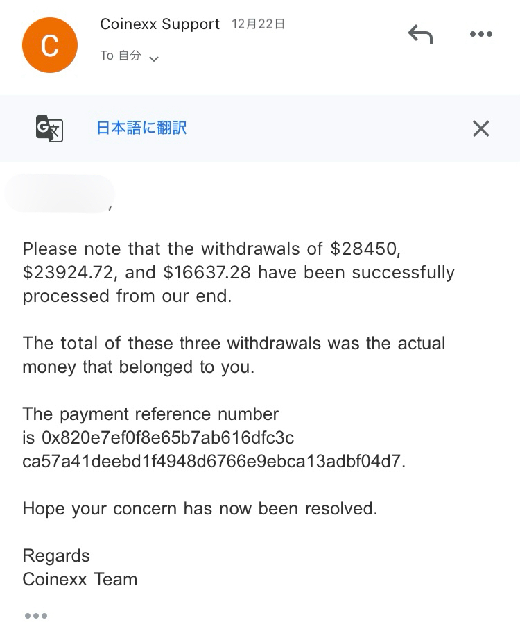 On January 4, Gaurav J, Coinexx's Executive Director and Head of Customer Relations, apologized for the disturbance and returned the unjustified adjustment, and the withdrawal was completed in full.