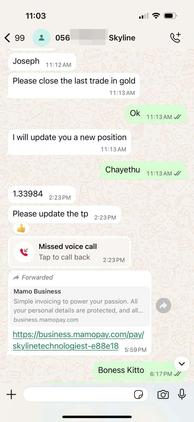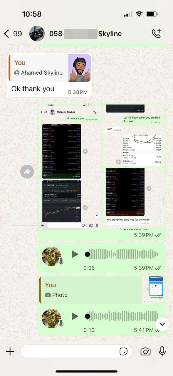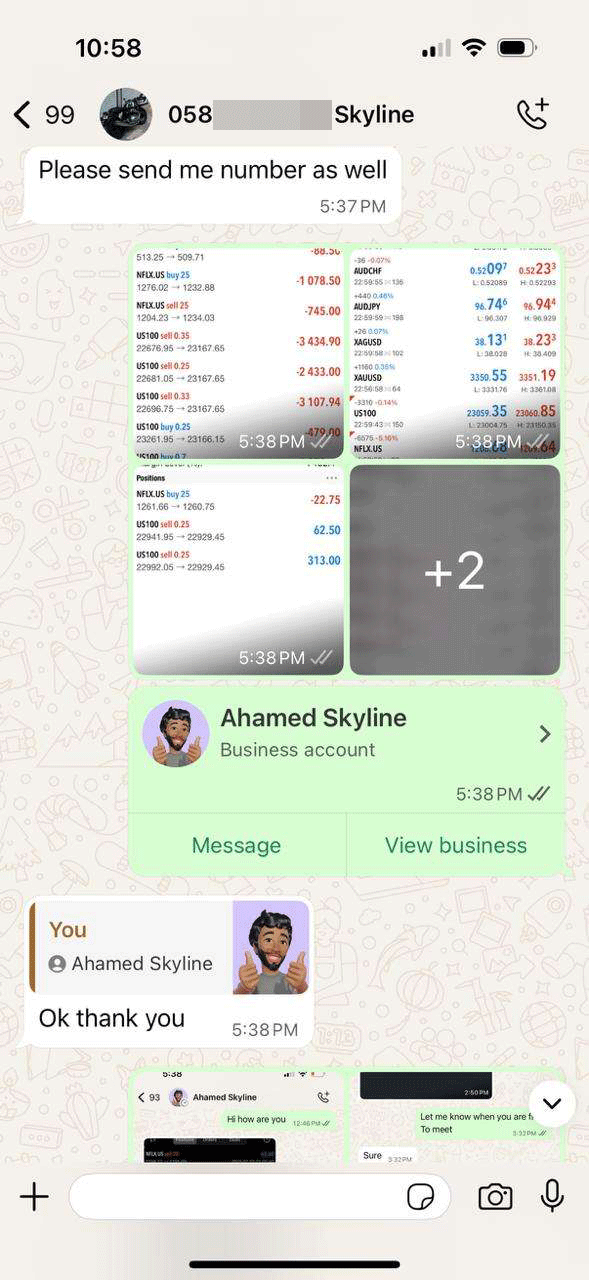 للأسف، بحلول ليلة الخميس، كانت جميع تداولاتي قد أسفرت عن خسائر، وطلب مني دفع فوري للتعويض قدره 3,900 دولار، والذي دفعته. بعد ذلك، توقف أحمد زياد عن الرد، وكان من الواضح أن مشاركته قد انتهت.بعد فترة وجيزة، تلقيت مكالمة من جيشنو +971 ** *** 4269، الذي حاول تطميني وعرض دعمه. بدأت أثق به لأنه كان الشخص الأول من Skyline الذي أوضح لي خياراتي بوضوح وقدم لي مدير حساب جديد اسمه فيشnu +971 ** *** 0627. أبلغوني أنه لمتابعة التداول، أحتاج إلى استثمار إضافي قدره 2,000 دولار لاسترداد خسائري السابقة، مما وافقت عليه على مضض، آملاً في الحصول على دعم مناسب لتداولات أصغر.لاحقًا، حثني جيشنو على استثمار 3,000 دولار أخرى في الذهب من أجل أرباح مضمونة، متعهدًا بأنني يمكنني كسب 2,000 دولار وسحبها في اليوم التالي. بينما تلقيت ربحًا قدره 1,250 دولار، وجهني إلى سحب 1,700 دولار.