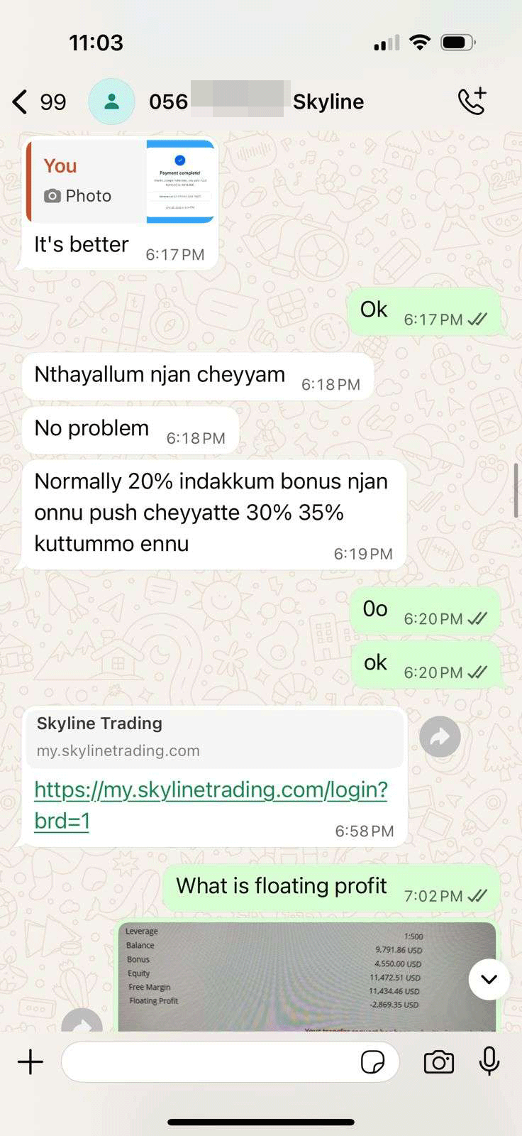 من 3 يونيو حتى 1 يوليو، تلقيت العديد من المكالمات والرسائل من أفصل +971 ** *** 6224 ورضوان +971 ** *** 8486. على الرغم من تعبيراتي المتكررة عن عدم اهتمامي، واصلوا الاتصال بي، مؤكدين لي دعمهم والنجاح الذي يمكنني تحقيقه مع سكاي لاين تريدينغ. شعرت بالضغط للانضمام.وفقًا لرضوان، دفعت في البداية 1000 دولار وتم تعييني مدير علاقات (RM) أحمد زياد +971 ** *** 6891. كان يطمئنني باستمرار بضمان 100% على استثماراتي، مما دفعني لودع 10000 دولار تحت ذريعة أنني يمكنني سحبها في غضون أسبوع. ومع ذلك، تم توجيهي لفتح العديد من الصفقات بمبالغ شراء وبيع مرتفعة. عندما بدأت الشكوك تتسلل، تواصلت معه حول مخاوفي، لكنه أصر على أن كل شيء على ما يرام، مدعيًا أن بعض الصفقات كانت مربحة.