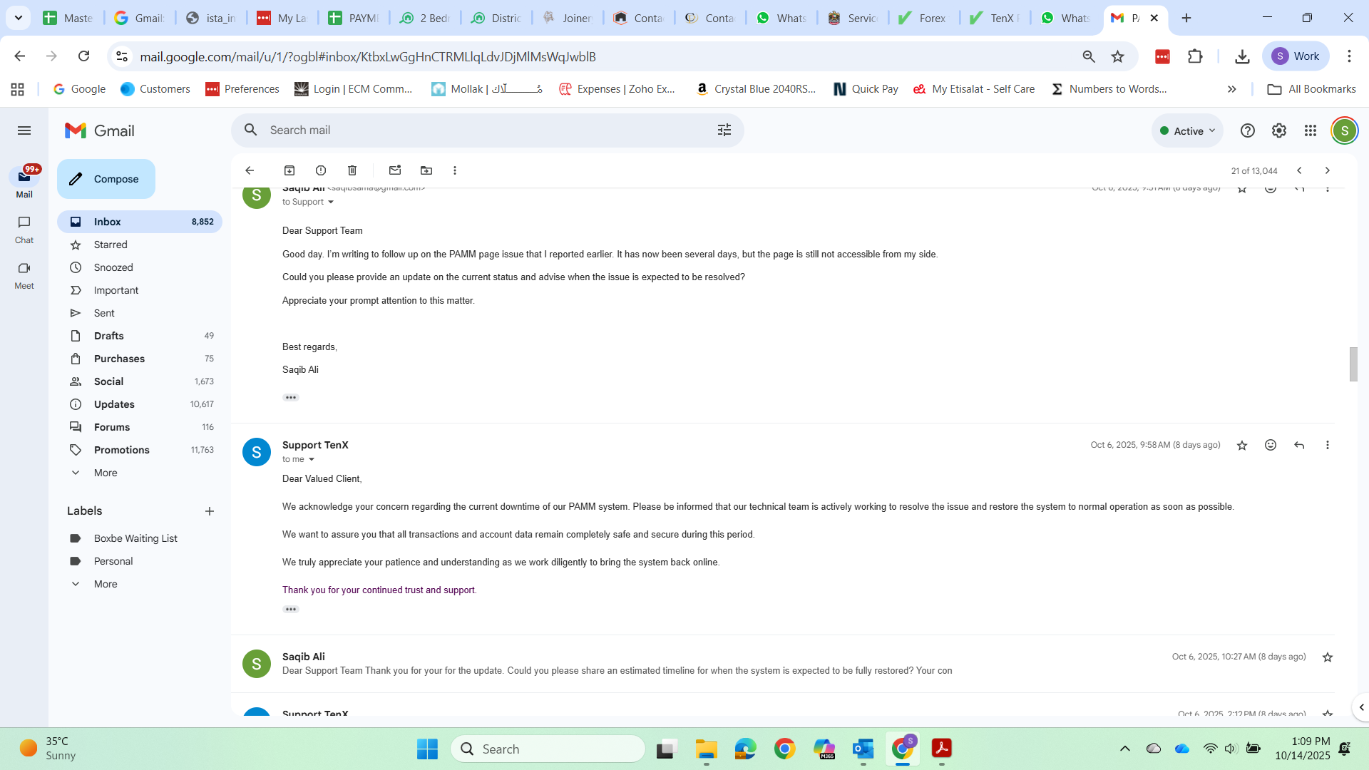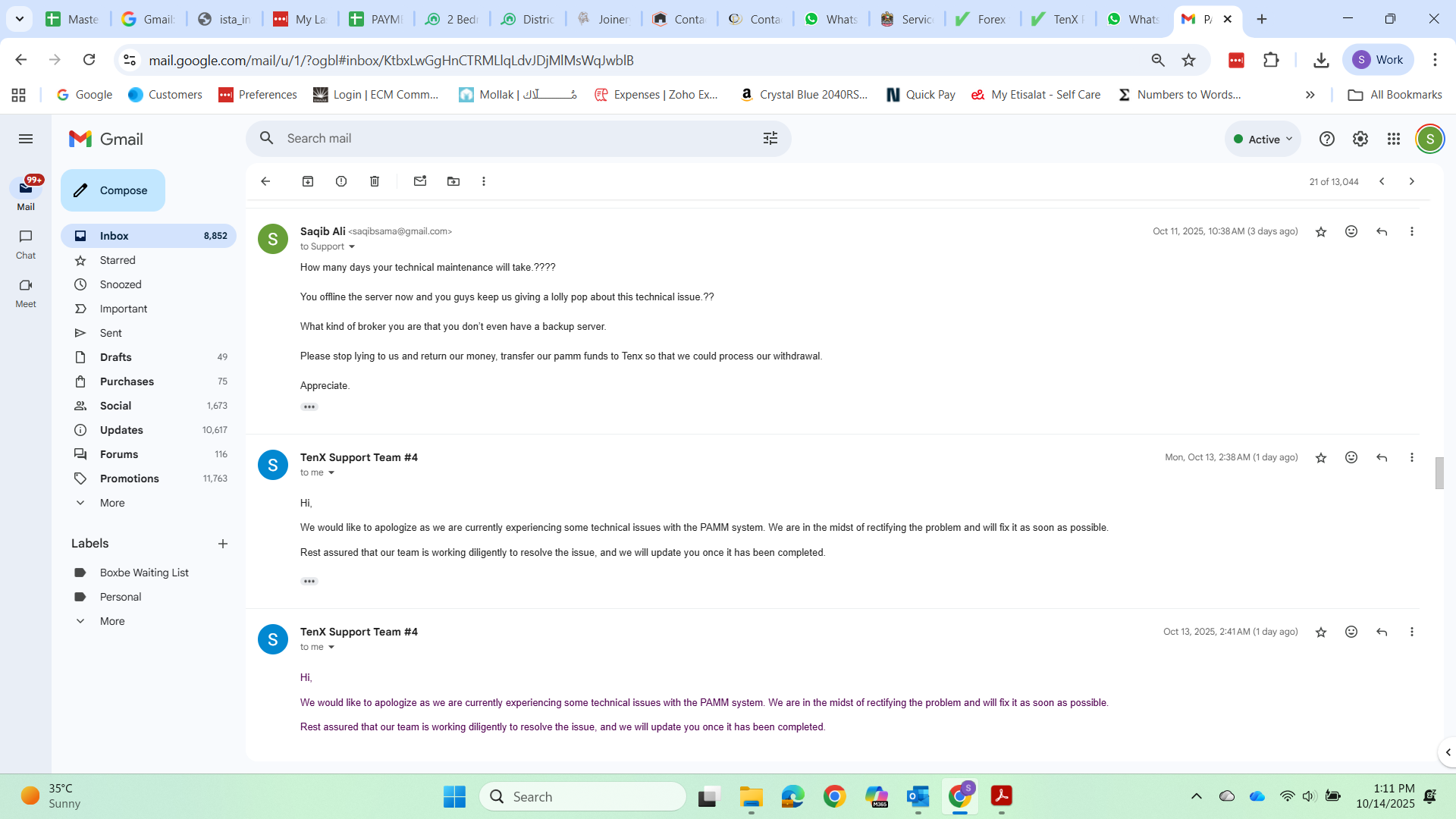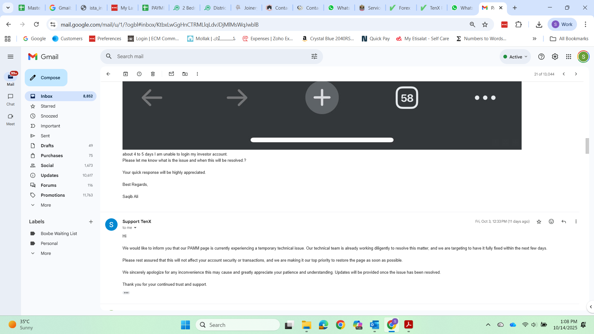My Conversation with broker visa support email attached, PAMM page Error attached, my Current balance in Tenx prime PAMM screenshot attached