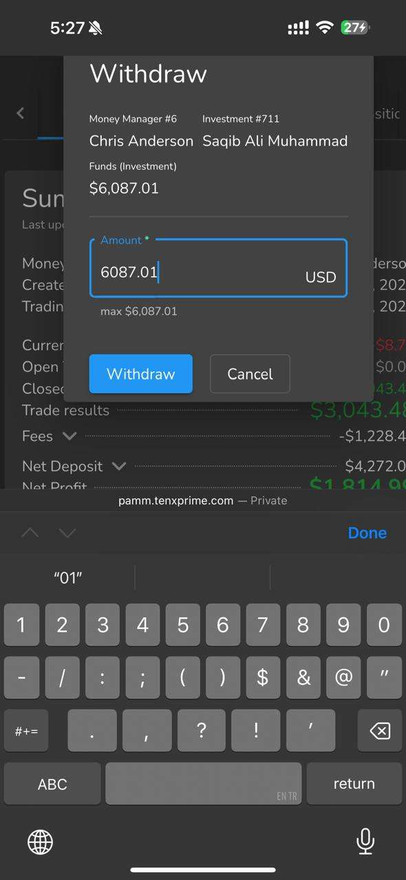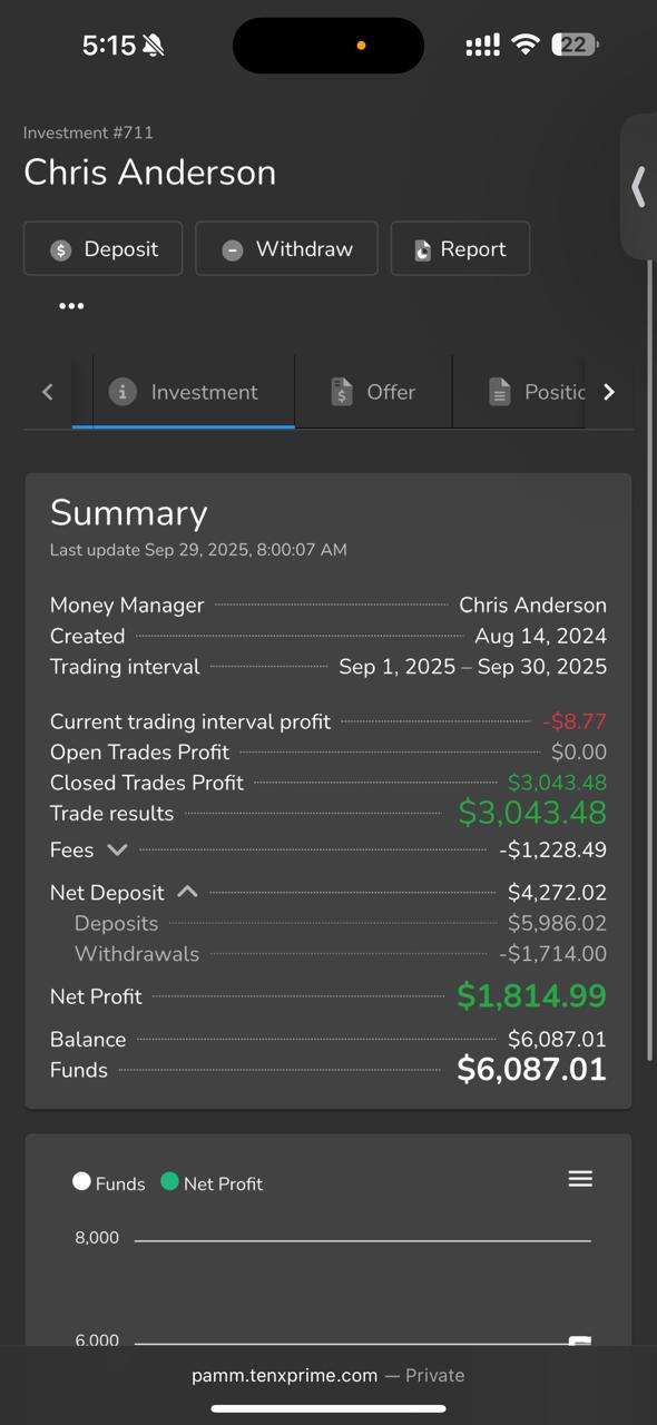 my balance with TENX PAMM left on September 30,2025 was USD 6085.01 initially I deposited 2,300 USD then in September 2025 I deposited 3,685 plus 100 USD was my profit share carried forward from August 2025.