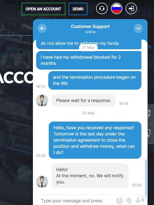 tomorrow the term ends according to the provision on termination of the contract, where it is stated to withdraw funds within 10 days. but the withdrawal still does not work, technical support still answers to wait.