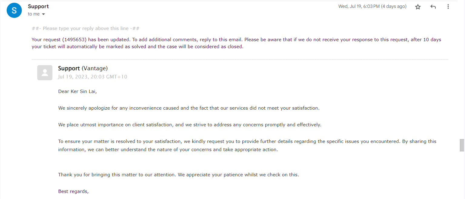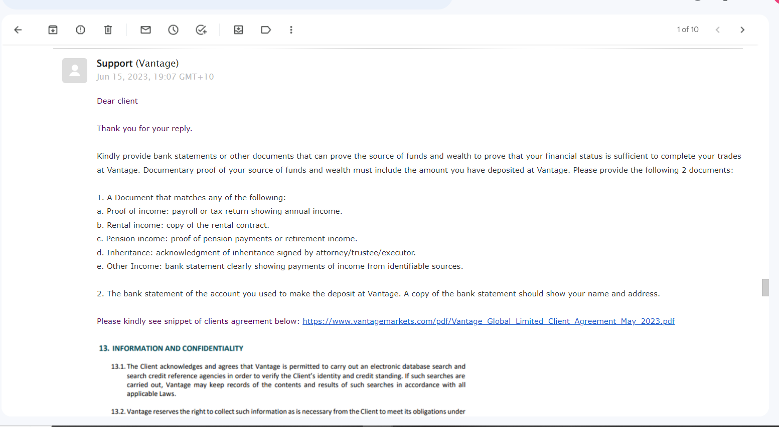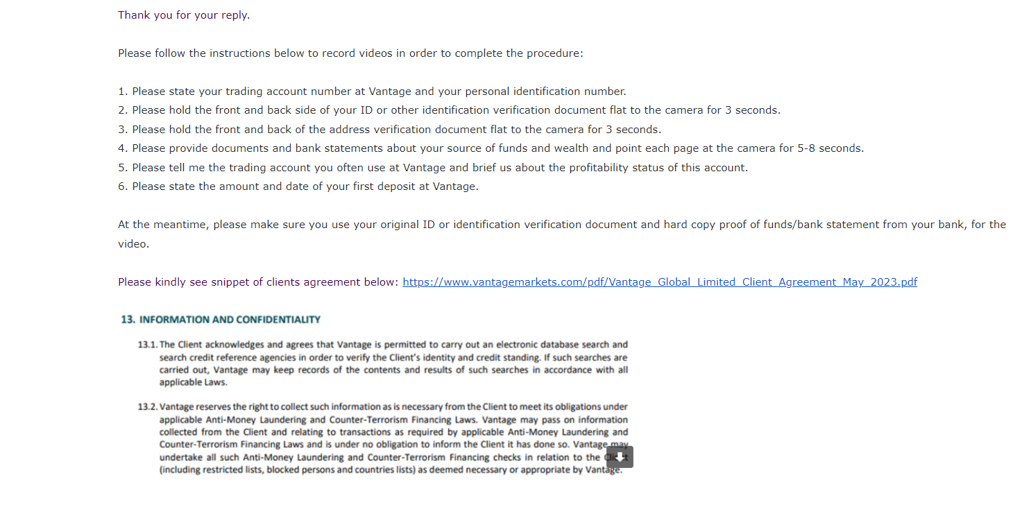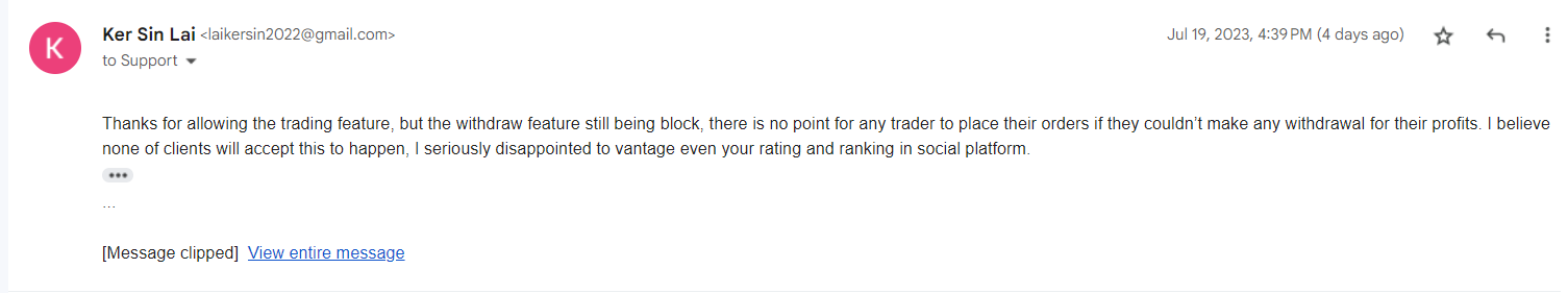 Hi there,I am writing to bring to your attention a serious issue I have encountered while using Vantage brokerage services. I am a client at Vantage and have been experiencing significant difficulties with withdrawing and removing funds from my account.Over the past month, I have attempted to withdraw funds from my account at Vantage, but to my dismay, I have been unable to do so. There have been no prior notices or explanations provided to me regarding any limitations on withdrawals, which has led to immense frustration and concern on my part.As a responsible and informed investor, I understand that there might be certain regulatory and compliance requirements that brokers need to adhere to. However, I urge you to communicate these restrictions clearly and transparently to your clients, especially when it impacts their ability to manage their own funds.I kindly request a thorough investigation into this matter and a detailed explanation for the sudden limitation on withdrawals and fund removal from my account.Thanks.