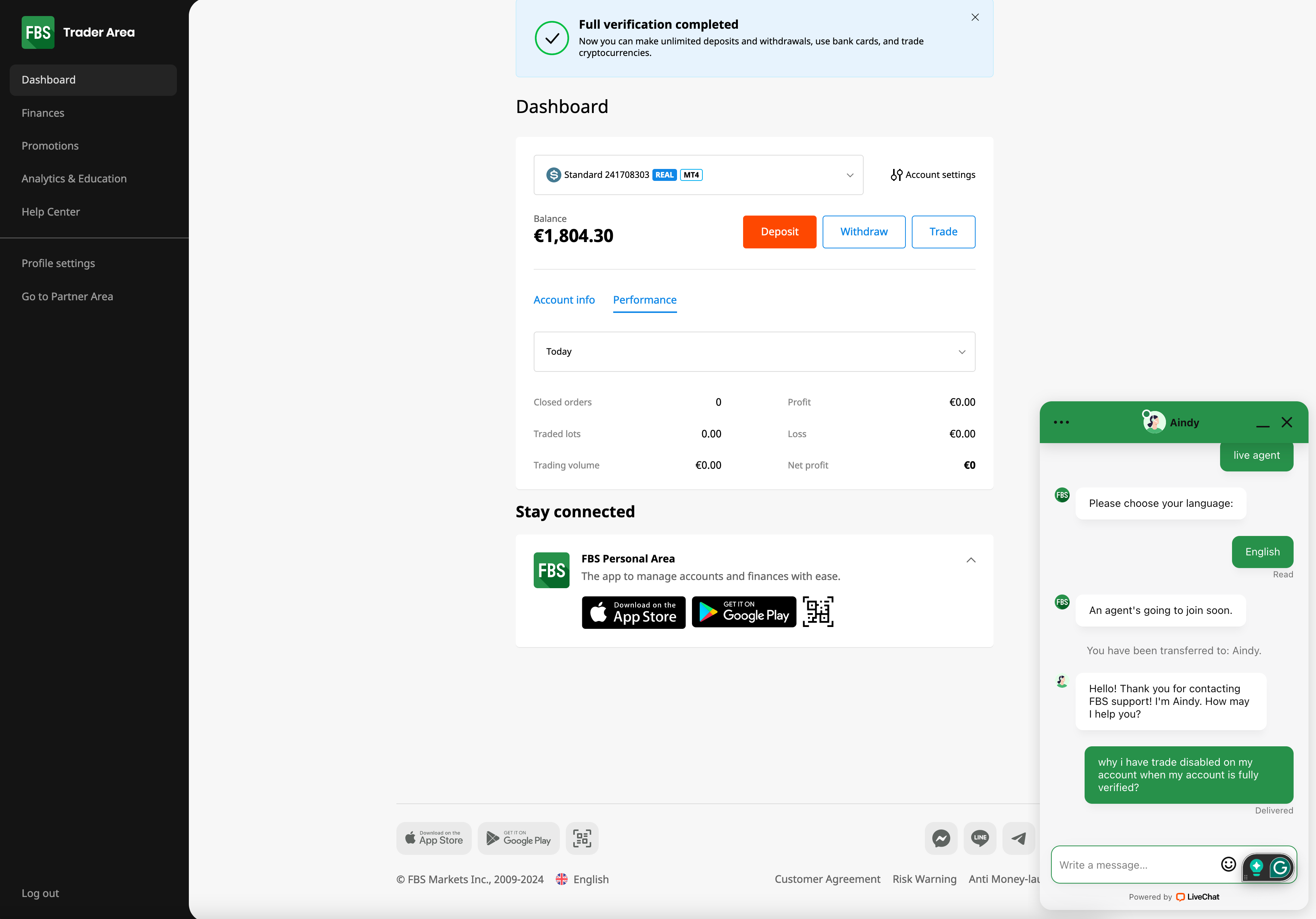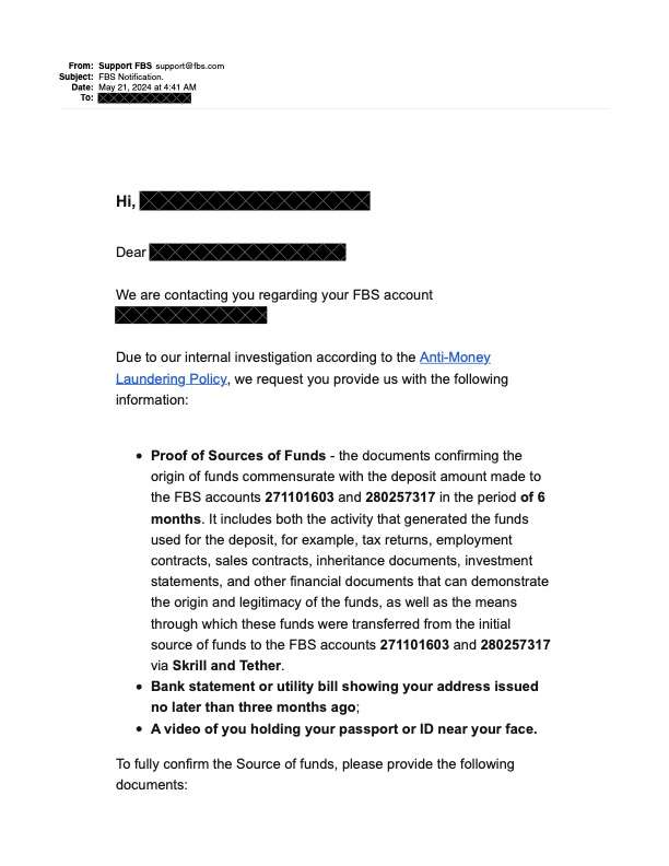 I've had my account with them for a solid five years, and it's been fully verified. Recently, I opened a new MT4 account, deposited funds two months ago, and have been actively trading since. To my surprise, I discovered today that my trading activity was abruptly disabled. Upon checking my email, I found correspondence from FBS stating that my account has been frozen due to an internal investigation related to their Anti-Money Laundering Policy. They're now requesting an extensive list of documents including proof of the sources of my funds, bank statements, utility bills, and even a video of me holding my passport or ID near my face.