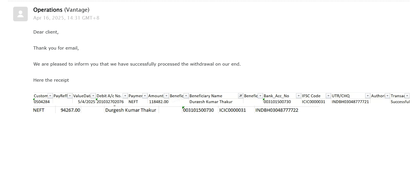 Though I have provided them my bank statement of one month few days before of withdrawal request till 3 week onwards just to clarify that I have not received the funds they claim. I got partial credit of 46267+48000+19482=113749 INR (that too not sure its from Vantage as based on their inputs the transaction amount and even the total of the amount is not matching)