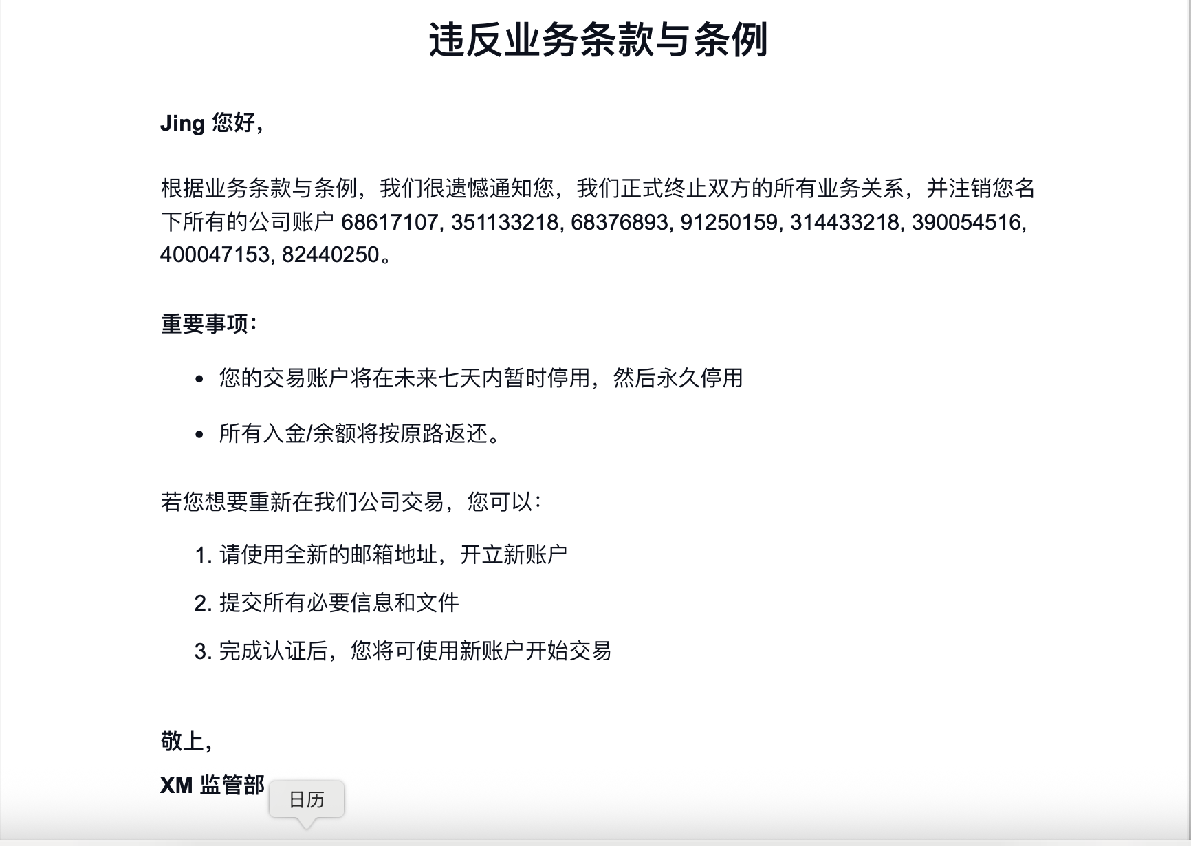 After I submitted a complaint, XM sent a notice to close all my accounts without clear reason, likely to destroy evidence and avoid accountability.