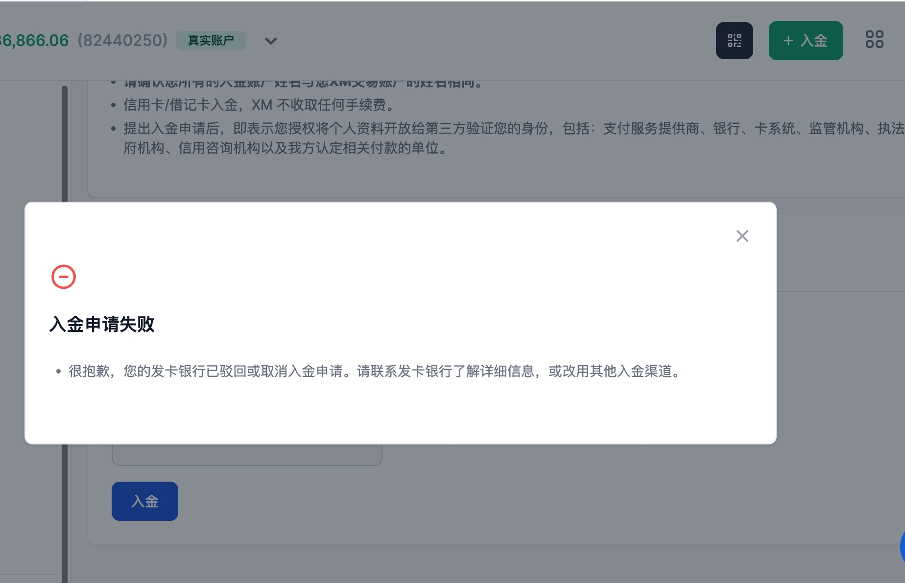 On April 22, 2025, I attempted to deposit funds with my valid bank card ending in 3926 to avoid margin call. XM’s platform rejected it multiple times. My bank confirmed it was not their issue, and I successfully used the same card to deposit into other brokers the same day.