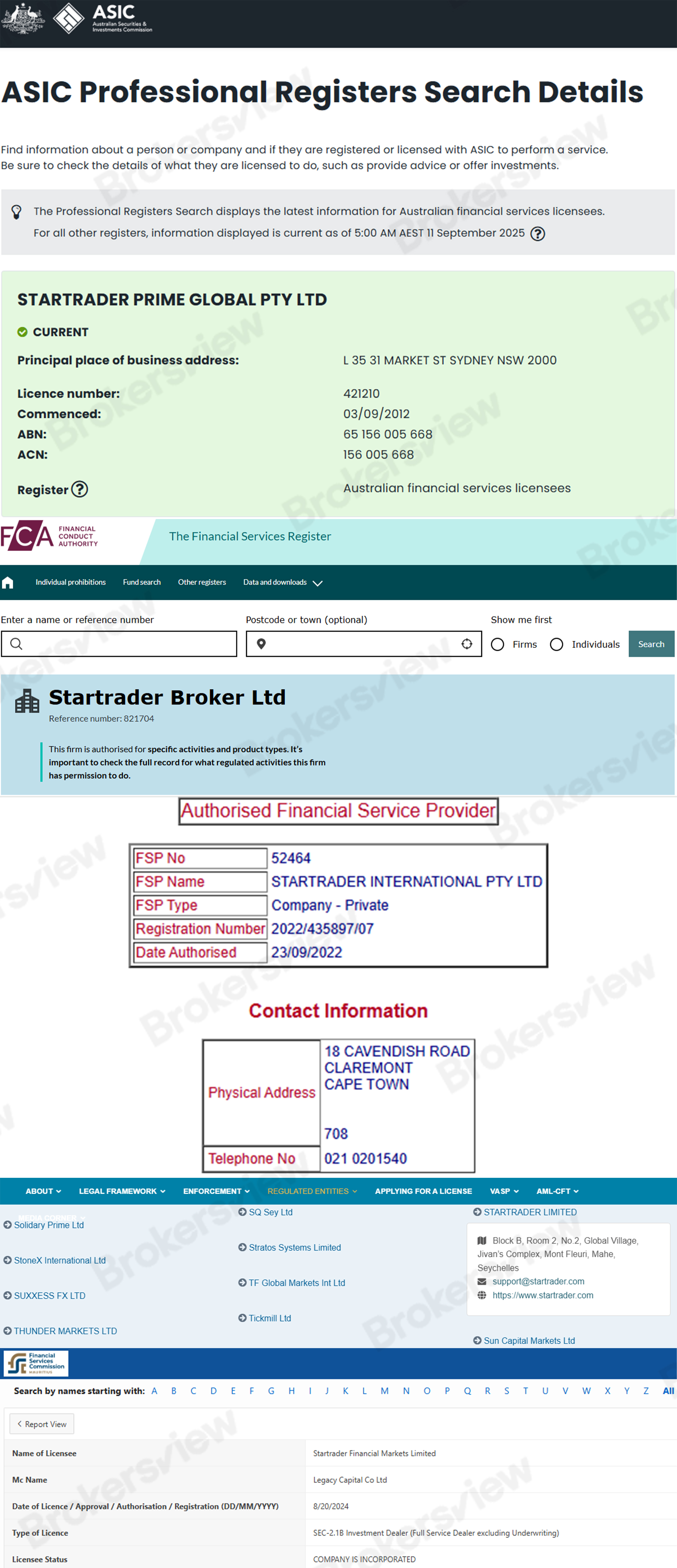 These include STARTRADER Prime Global Pty Ltd (ASIC, AFSL No. 421210), STARTRADER Broker Limited (FCA UK, Ref No. 821704), and STARTRADER International Pty Ltd (FSCA South Africa, FSP No. 52464). Two entities—STARTRADER Limited (FSA Seychelles, License No. SD049) and STARTRADER Financial Markets Limited (FSC Mauritius, License No. GB24203371)—are regulated under offshore frameworks, which typically offer weaker oversight and limited investor protection.