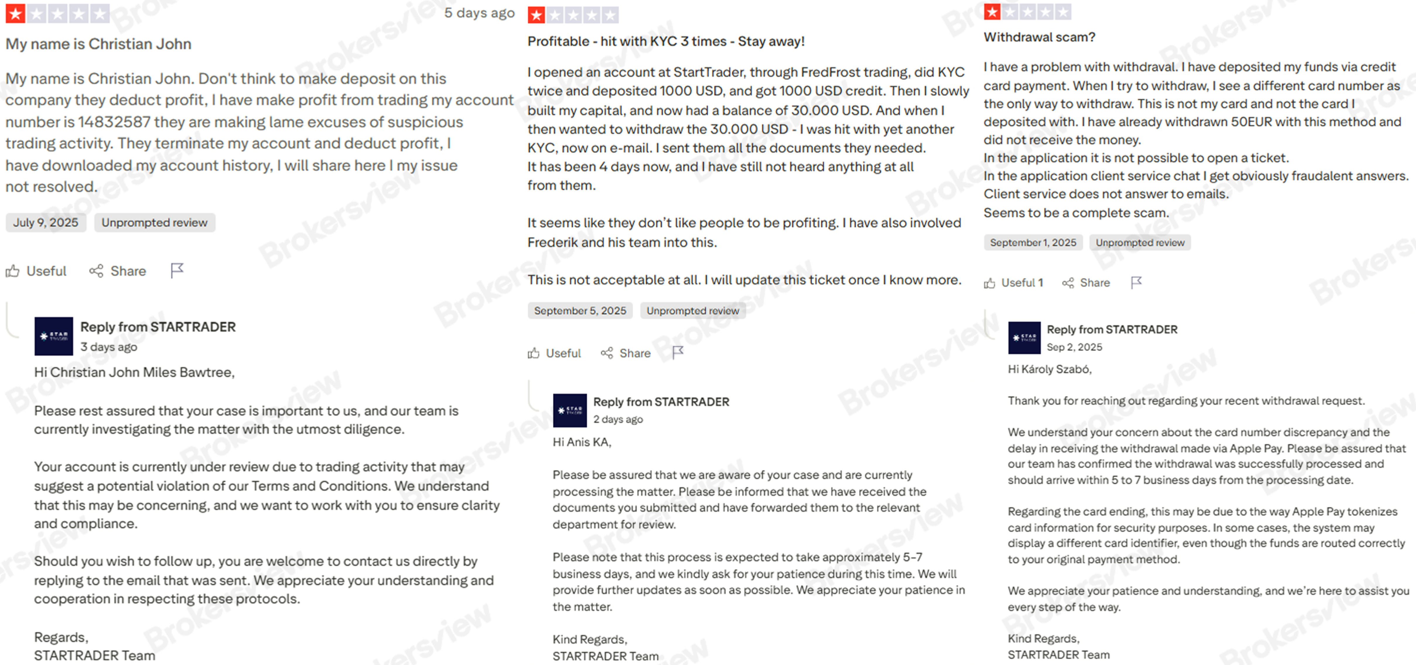 Recent client reports also include STARTRADER’s profit deductions labeled as “suspicious trading activity,” repeated KYC verification requests delaying withdrawals, and instances of unfulfilled withdrawal transactions.