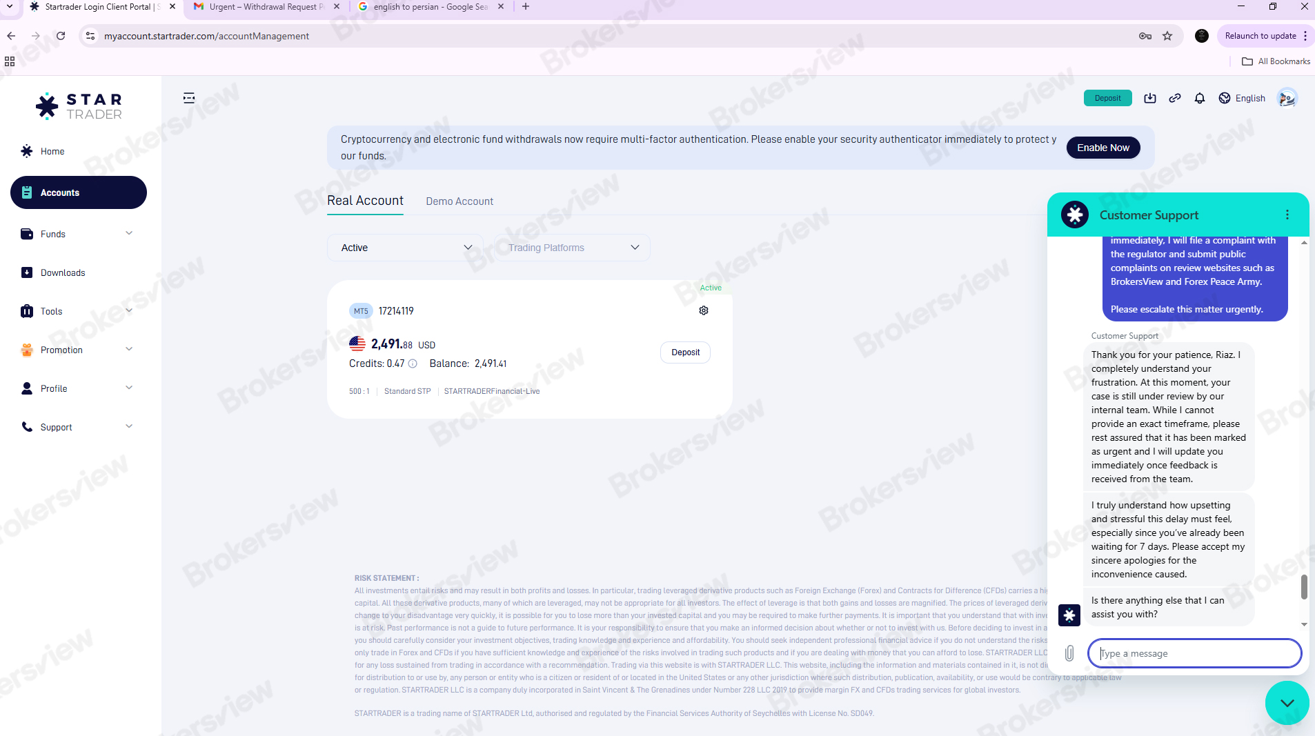 The client is requesting urgent resolution of his withdrawal issue. BrokersView has relayed the complaint to STARTRADER and is currently awaiting the broker’s response.