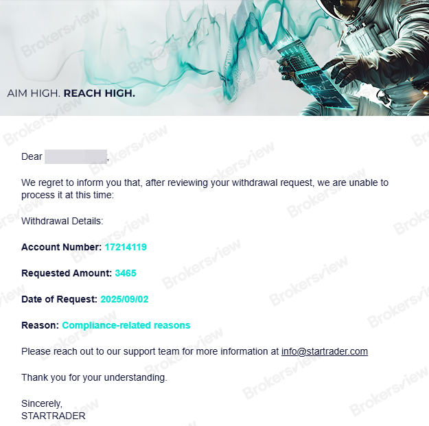 The client provided a screenshot showing that STARTRADER cited a “compliance-related” reason for the initial rejection, without offering further explanation.