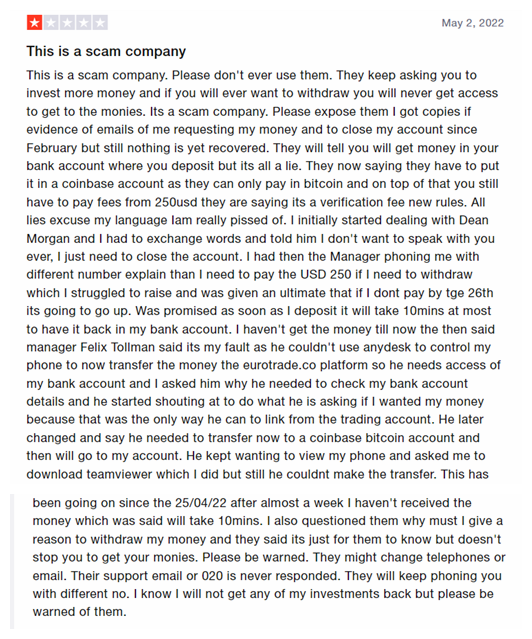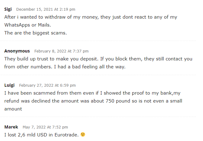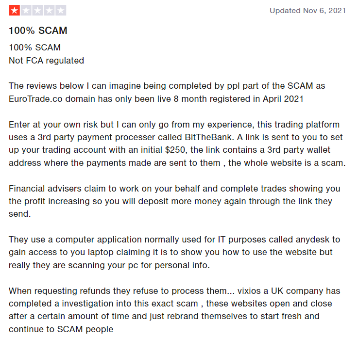 EuroTrade has got many negative reviews and investors who traded with this broker have raised many complaints against it. BrokersView has therefore investigated a lot about the company and based on the negative reviews, complaints and other scam features, we have listed the entity as a scam.