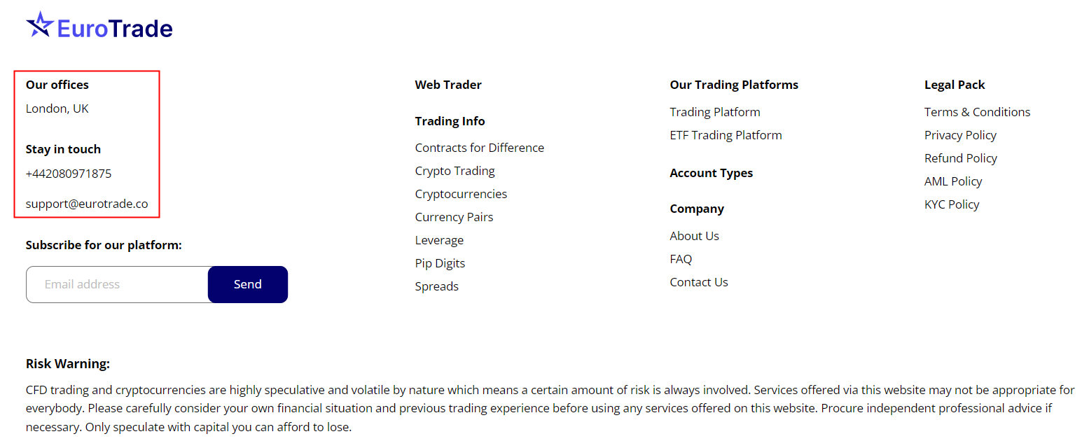Eurotrade claims to be a reliable broker without presenting any information about its regulation. Additionally, Eurotradep states its headquarters is in the London, UK. As per British law, all firms and individuals offering, promoting, or selling financial services or products in the UK shall be authorized by the United Kingdom Financial Conduct Authority (UK FCA). However, we found no results in the database of the FCA regulated brokers list. That means Eurotrade is an unlicensed broker, who is not authorized to provide financial services in the UK or any other jurisdictions.