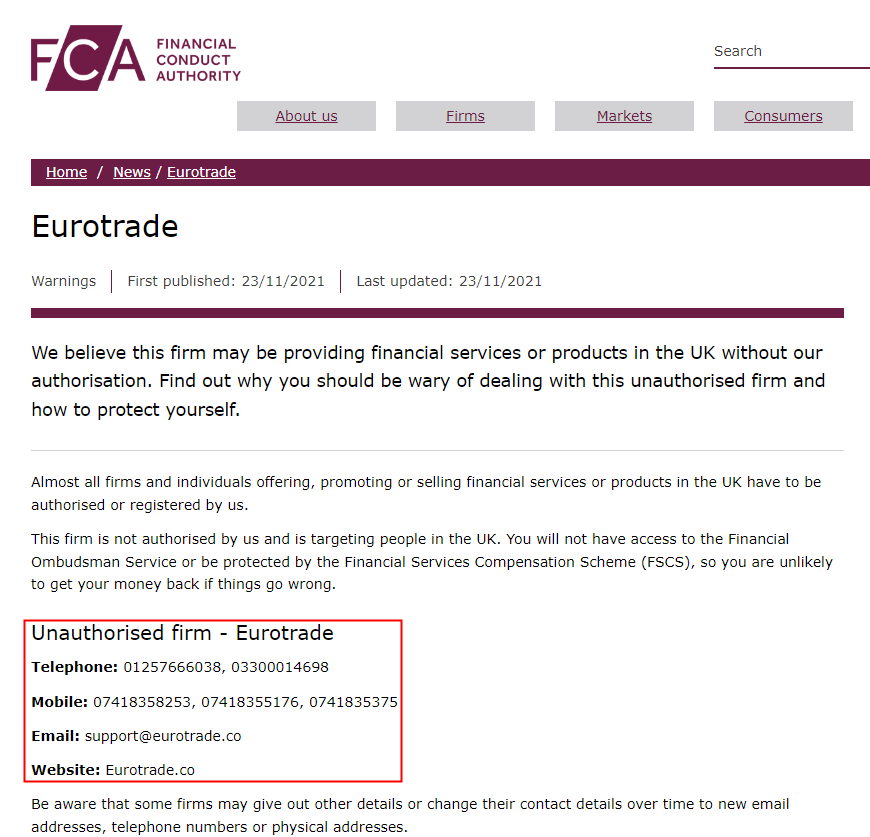 Last year, a warning record matched with Eurotrade on the FCA. According to the update, the watchdog warned the public that the entity is not authorised by it and is targeting people in the UK.