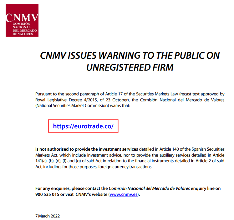 On 7 March2022, The Spanish National Securities Market Commission(CNMV) issued a warning that Eurotrade has not been authorized to carry out investment services and activities.